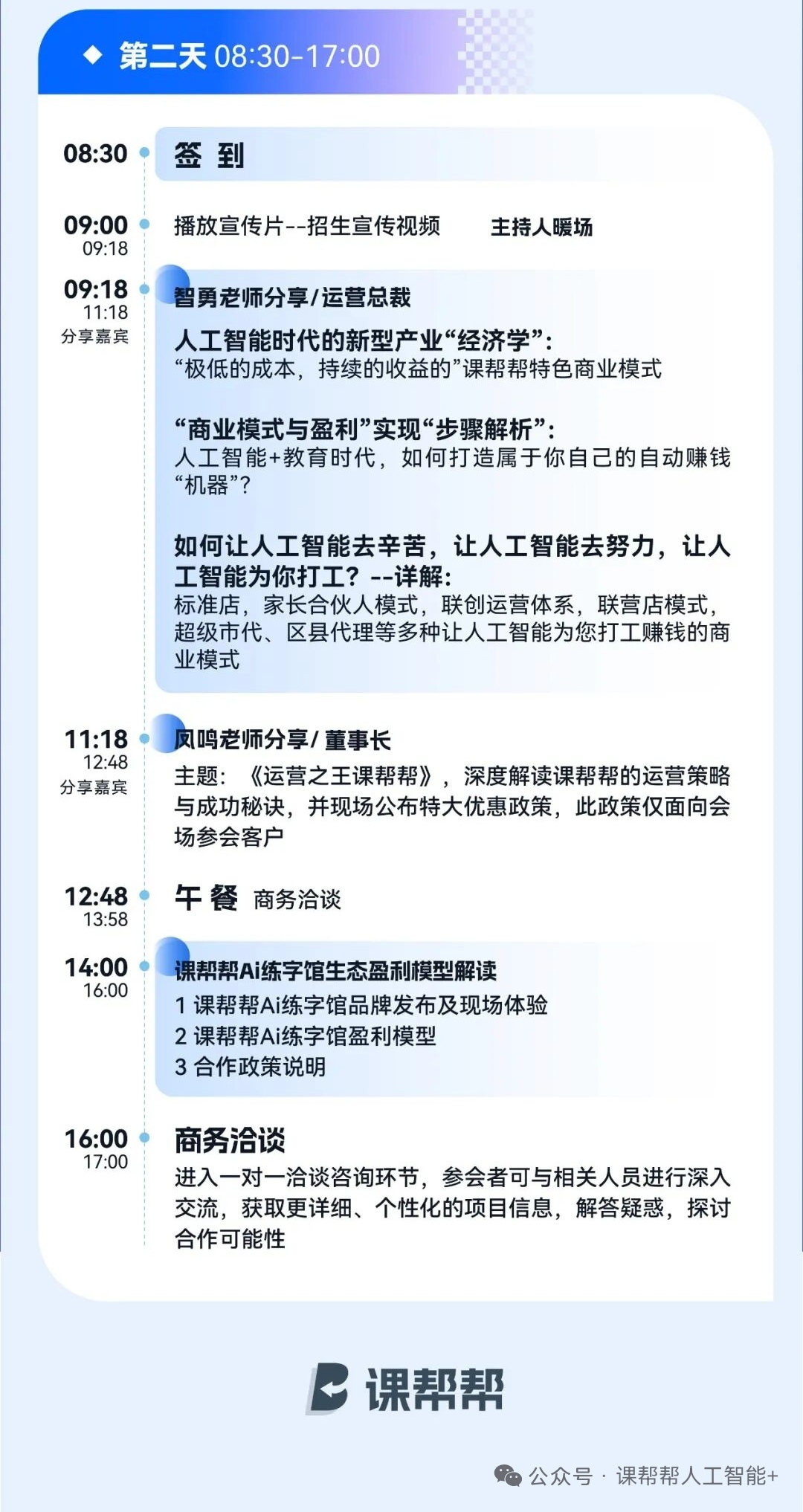 本次论坛将围绕“Ai智习室区域落地策略”与“教育+生态共建”展开深度分享。会议现场将结合本地化运营案例,详细解析Ai智习室在提升学员续费、优化机构人效、拓展服务场景方面的实际成效,并展示课帮帮在师资培训、招生支持、数据管理等方面的全链条赋能体系