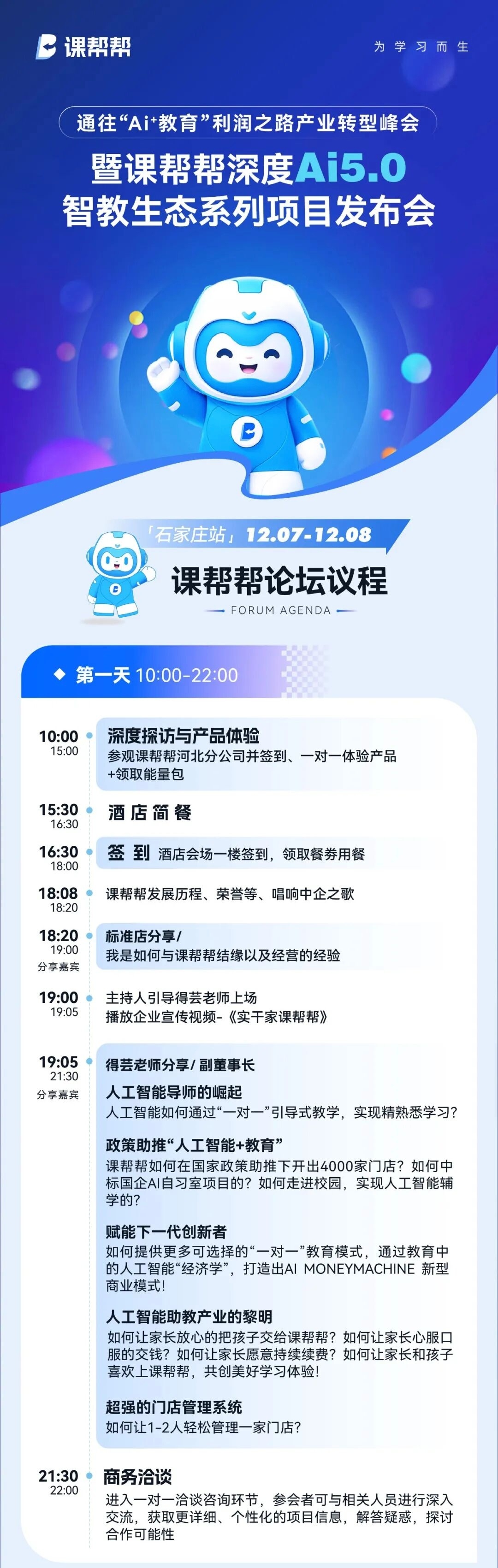 通往"AI+教育"利润之路产业转型峰会石家庄站项目招商会今日隆重开幕。本场会议由课帮帮河北分公司负责筹办,与会嘉宾将深度探访课帮帮AI智习室以"软硬智联+精准教育"的生态矩阵;同时感知课帮帮AI智习室如何通过"一对一"引导式教学,实现精熟悉学习,现场直观感受课帮帮与传统教育硬件销售模式的本质区别。