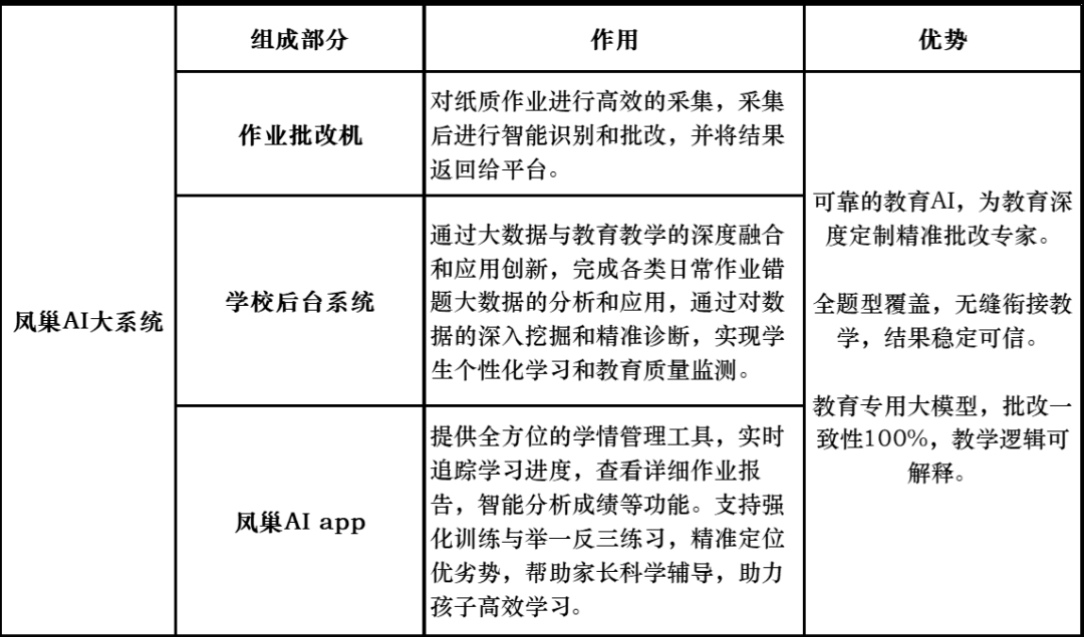 1.作业批改机凤巢AI作业批改机调用梦想大模型、OCR识别、知识图谱、智能推荐等底层能力,集自由组卷、智能批改、原卷留痕、学情诊断、错题巩固、资源沉淀等场景应用于一体,通过AI大模型赋能批改减负、通过学业数据沉淀助力精准教学、通过共/个性错题巩固助力自主学习闭环。