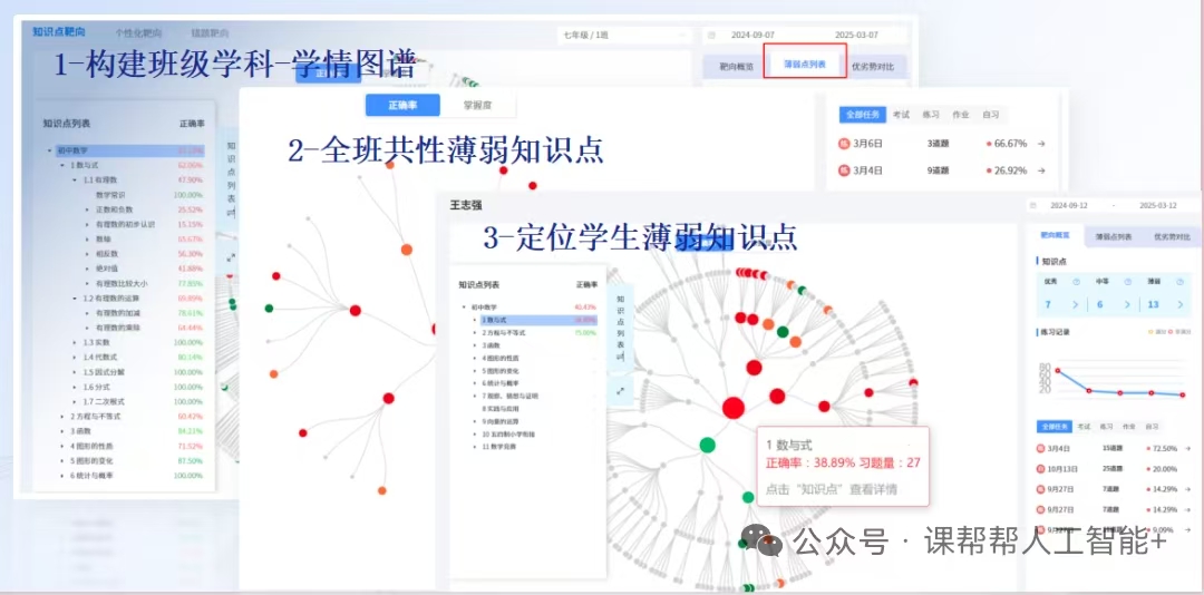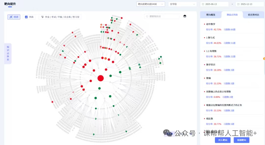 构建班级学情图谱,班级共性错题及全班共性薄弱知识点、个人错题及定位学生薄弱知识点。