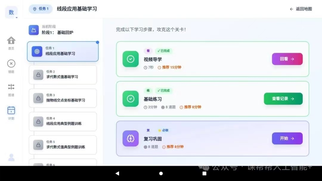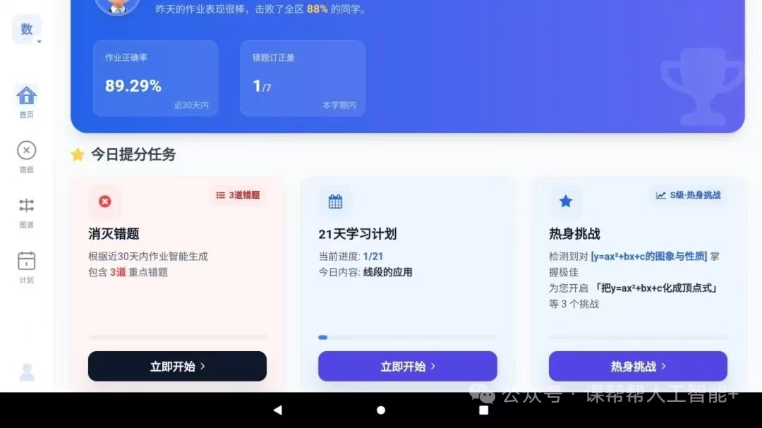 3.凤巢AI app凤巢AI平板端app主要分为4大功能:21天定向提升计划、消灭错题、超前学、知识点图谱。