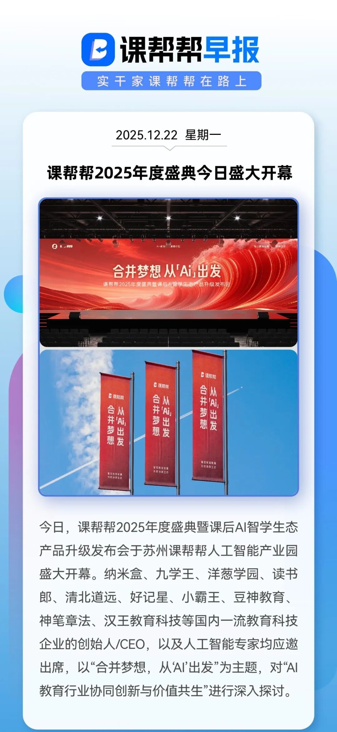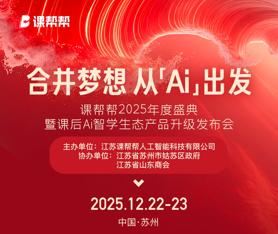 今日,课帮帮2025年度盛典暨课后AI智学生态产品升级发布会于苏州课帮帮人工智能产业园盛大开幕。纳米盒,九学王,洋葱学园,读书郎,清北道远,好记星,小霸王,豆神教育,神笔章法,汉王教育科技等国内一流教育科技企业的创始人/CEO,以及人工智能专家均应邀出席,以"合并梦想,从"AI'出发"为主题,对"AI教育行业协同创新与价值共生"进行深入探讨。