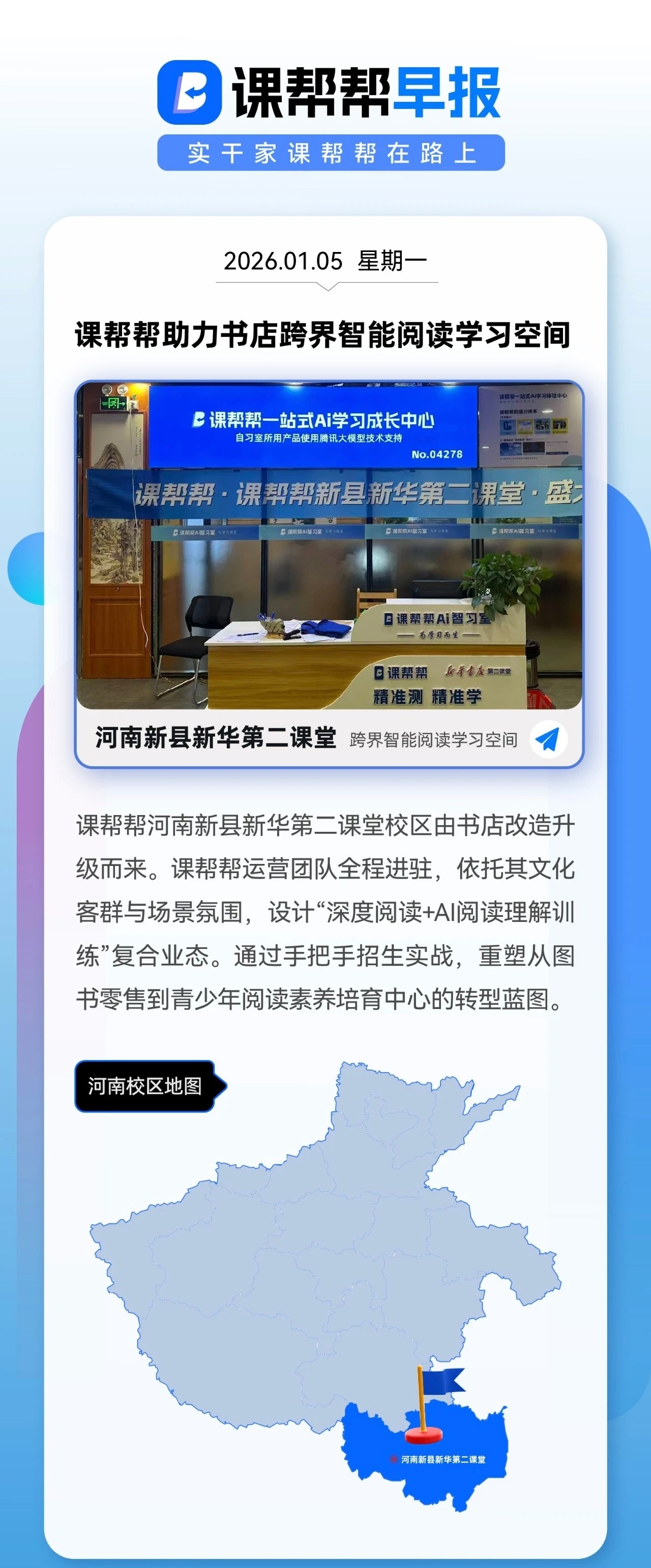 课帮帮河南新县新华第二课堂校区由书店改造升级而来。课帮帮运营团队全程进驻,依托其文化客群与场景氛围,设计"深度阅读+Al阅读理解训练"复合业态。通过手把手招生实战,重塑从图书零售到青少年阅读素养培育中心的转型蓝图。