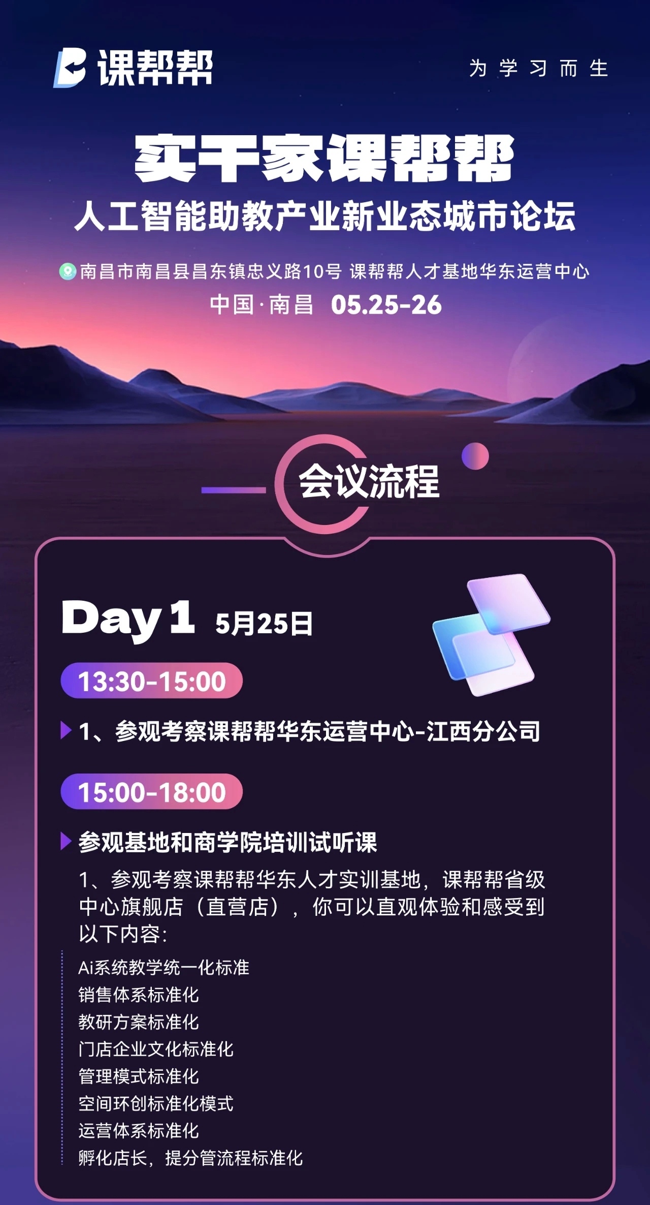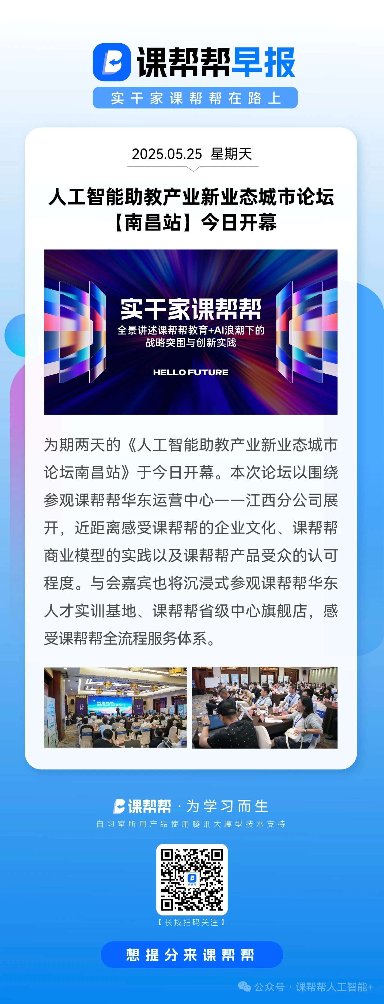 本次论坛以围绕参观课帮帮华东运营中心一一江西分公司展开,近距离感受课帮帮的企业文化、课帮帮商业模型的实践以及课帮帮产品受众的认可程度。与会嘉宾也将沉浸式参观课帮帮华东人才实训基地、课帮帮省级中心旗舰店,感受课帮帮全流程服务体系。
