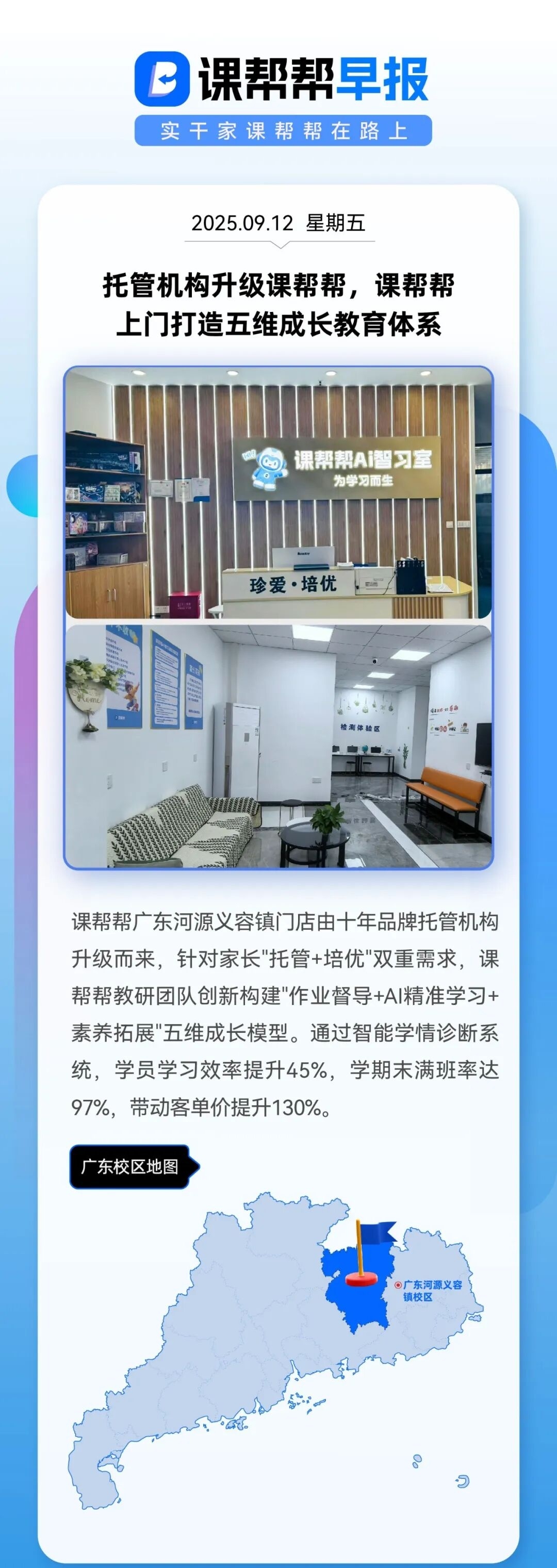 课帮帮广东河源义容镇门店由十年品牌托管机构升级而来,针对家长"托管+培优"双重需求,课帮帮教研团队创新构建"作业督导+AI精准学习+素养拓展"五维成长模型。通过智能学情诊断系统,学员学习效率提升45%,学期末满班率达97%,带动客单价提升130%。