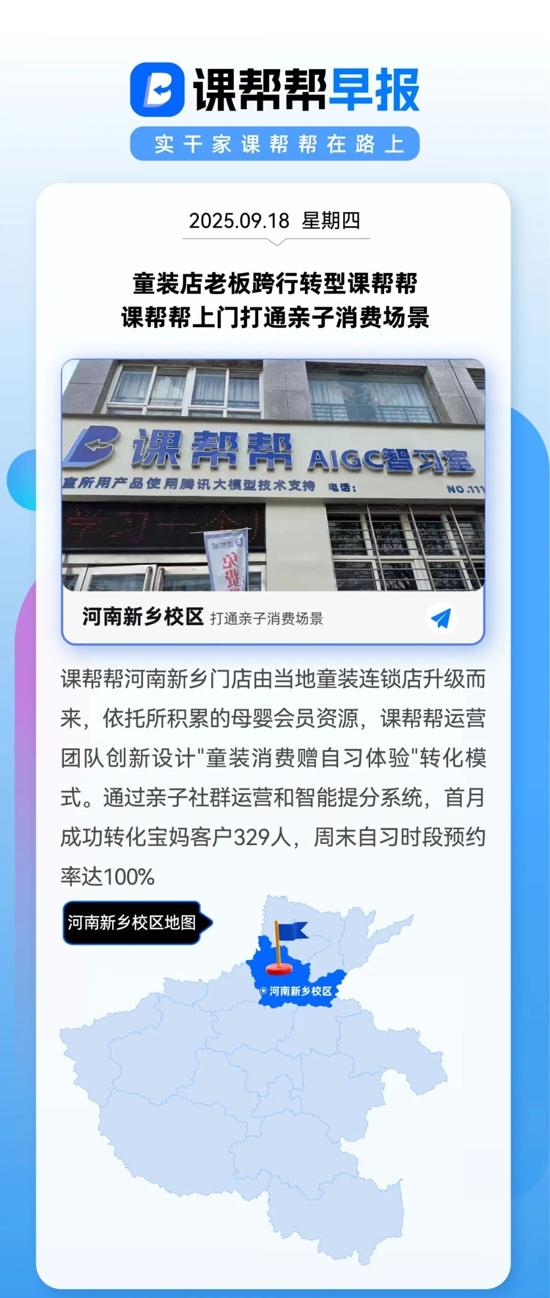 课帮帮河南新乡门店由当地童装连锁店升级而来,依托所积累的母婴会员资源,课帮帮运营团队创新设计"童装消费赠自习体验"转化模式。通过亲子社群运营和智能提分系统,首月成功转化宝妈客户329人,周末自习时段预约率达100%