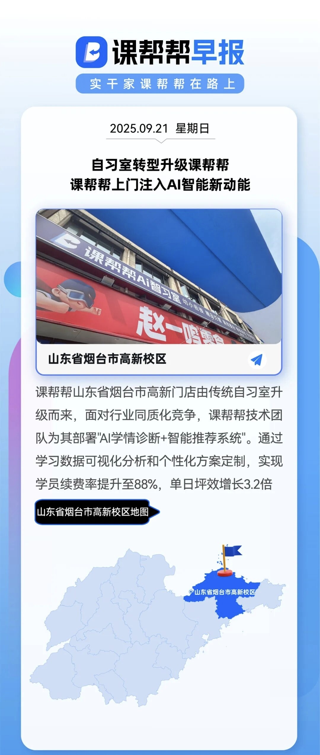 课帮帮山东省烟台市高新门店由传统自习室升级而来,面对行业同质化竞争,课帮帮技术团队为其部署"AI学情诊断+智能推荐系统"。通过学习数据可视化分析和个性化方案定制,实现学员续费率提升至88%,单日坪效增长3.2倍