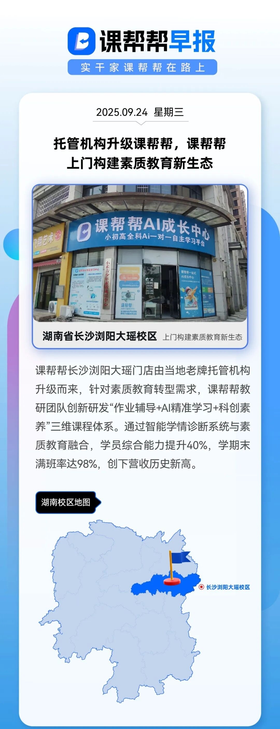 课帮帮长沙浏阳大瑶门店由当地老牌托管机构升级而来,针对素质教育转型需求,课帮帮教研团队创新研发“作业辅导+AI精准学习+科创素养”三维课程体系。通过智能学情诊断系统与素质教育融合,学员综合能力提升40%,学期末满班率达98%,创下营收历史新高。