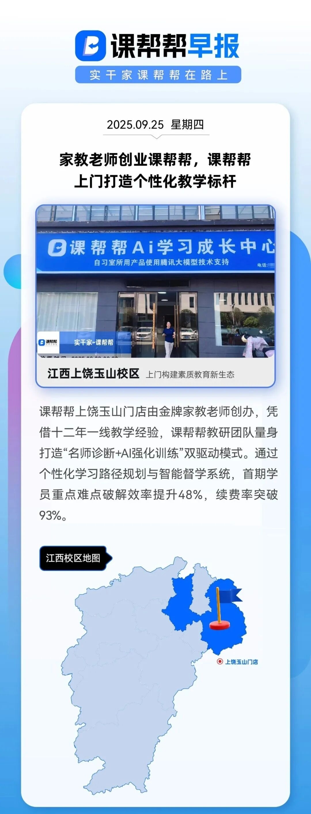 课帮帮上饶玉山门店由金牌家教老师创办,凭借十二年一线教学经验,课帮帮教研团队量身打造“名师诊断+AI强化训练”双驱动模式。通过个性化学习路径规划与智能督学系统,首期学员重点难点破解效率提升48%,续费率突破93%。