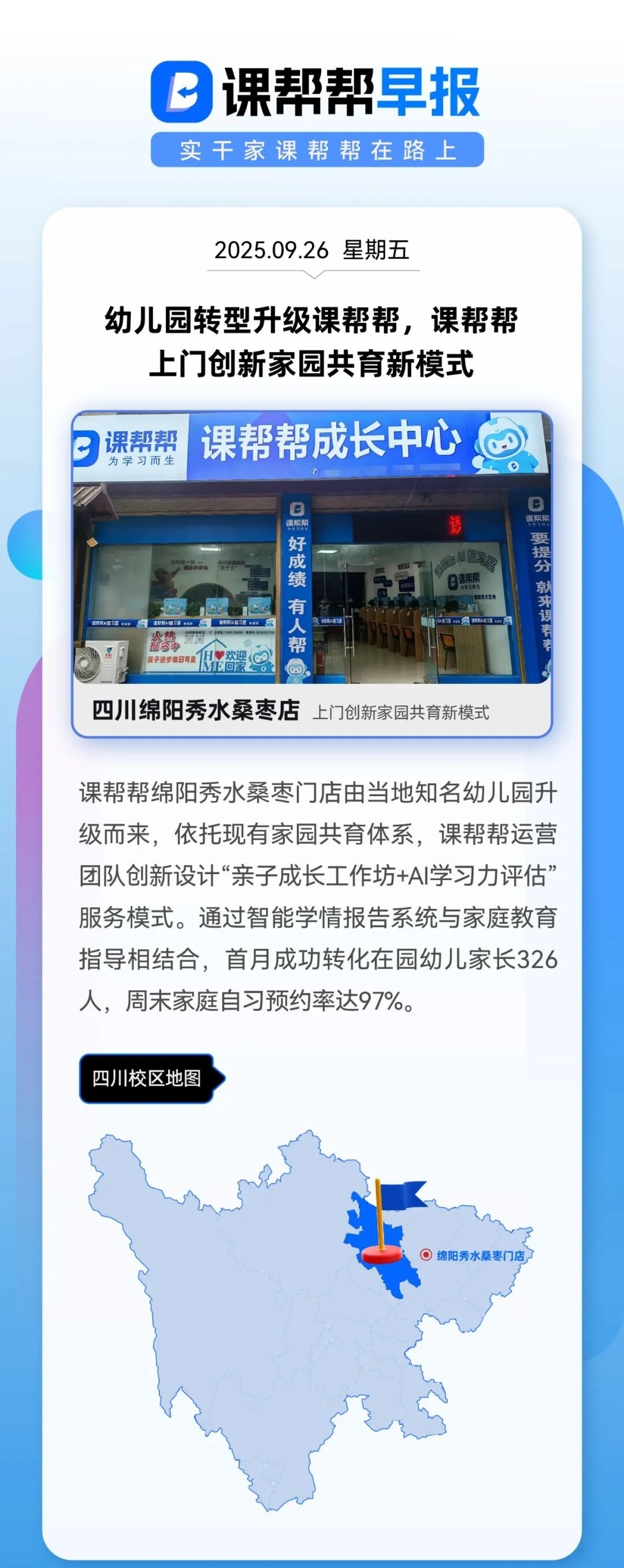 课帮帮绵阳秀水桑枣门店由当地知名幼儿园升级而来,依托现有家园共育体系,课帮帮运营团队创新设计“亲子成长工作坊+AI学习力评估”服务模式。通过智能学情报告系统与家庭教育指导相结合,首月成功转化在园幼儿家长326人,周末家庭自习预约率达97%。