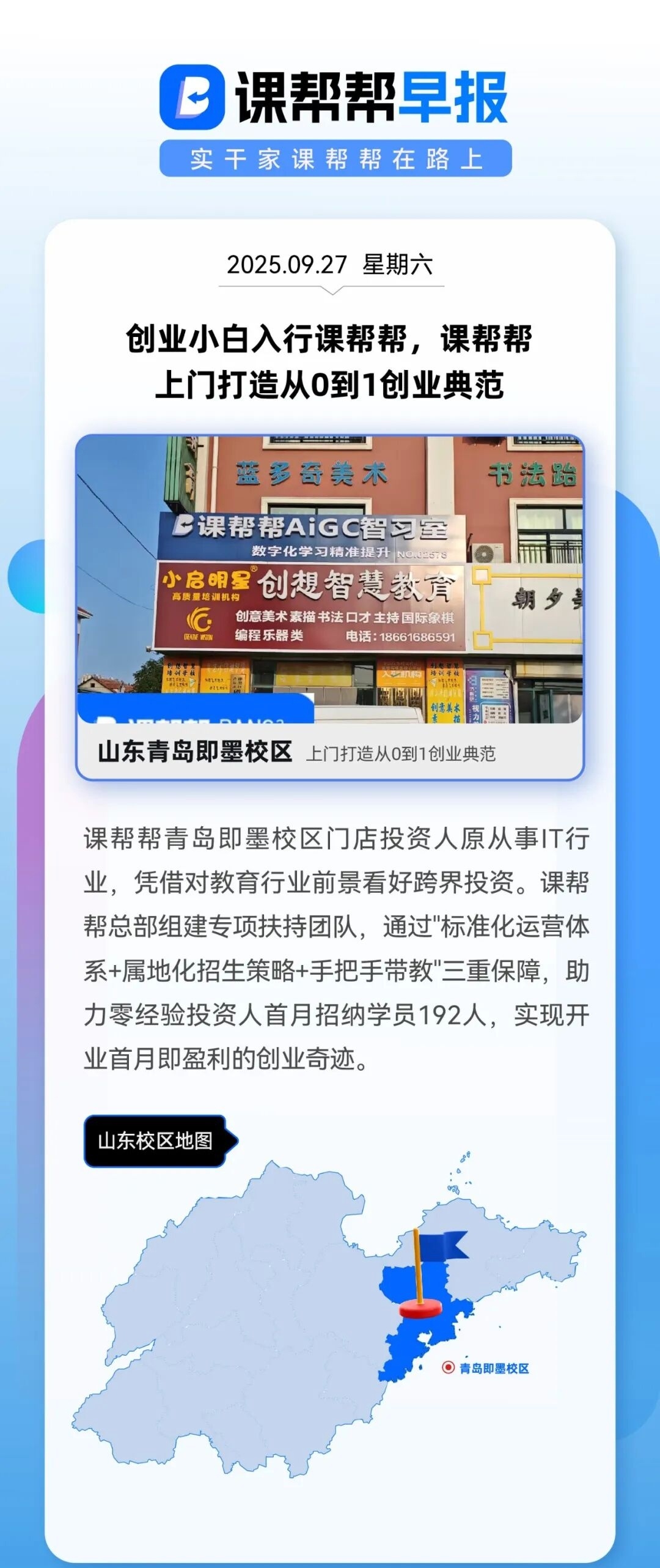 课帮帮青岛即墨校区门店投资人原从事IT行业,凭借对教育行业前景看好跨界投资。课帮帮总部组建专项扶持团队,通过"标准化运营体系+属地化招生策略+手把手带教"三重保障,助力零经验投资人首月招纳学员192人,实现开业首月即盈利的创业奇迹。
