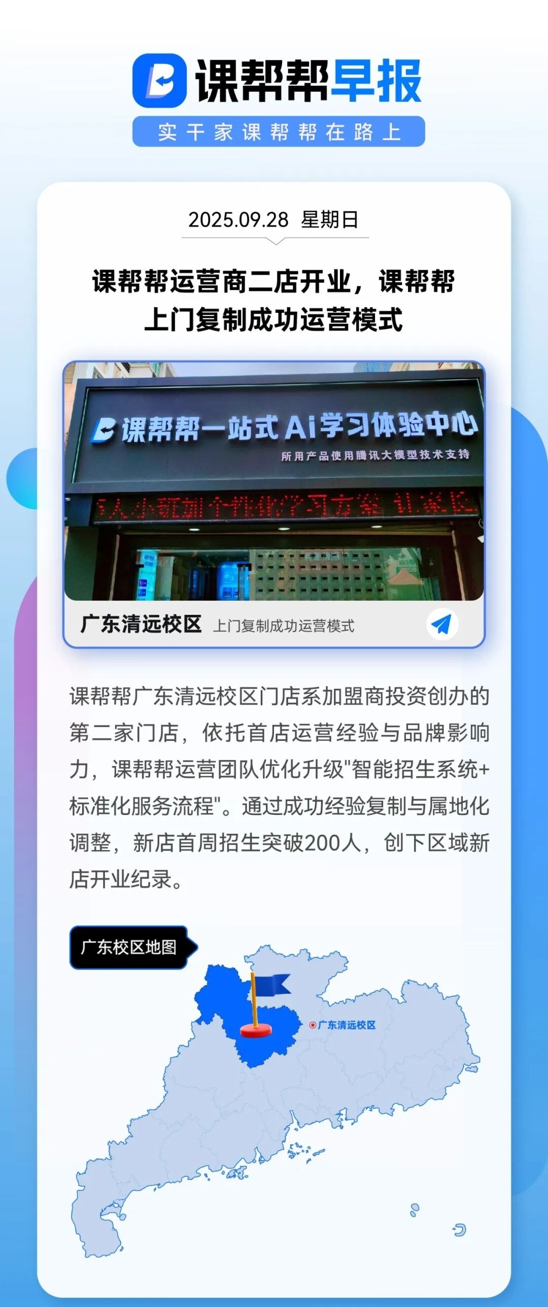 课帮帮广东清远校区门店系加盟商投资创办的第二家门店,依托首店运营经验与品牌影响力,课帮帮运营团队优化升级"智能招生系统+标准化服务流程"。通过成功经验复制与属地化调整,新店首周招生突破200人,创下区域新店开业纪录。