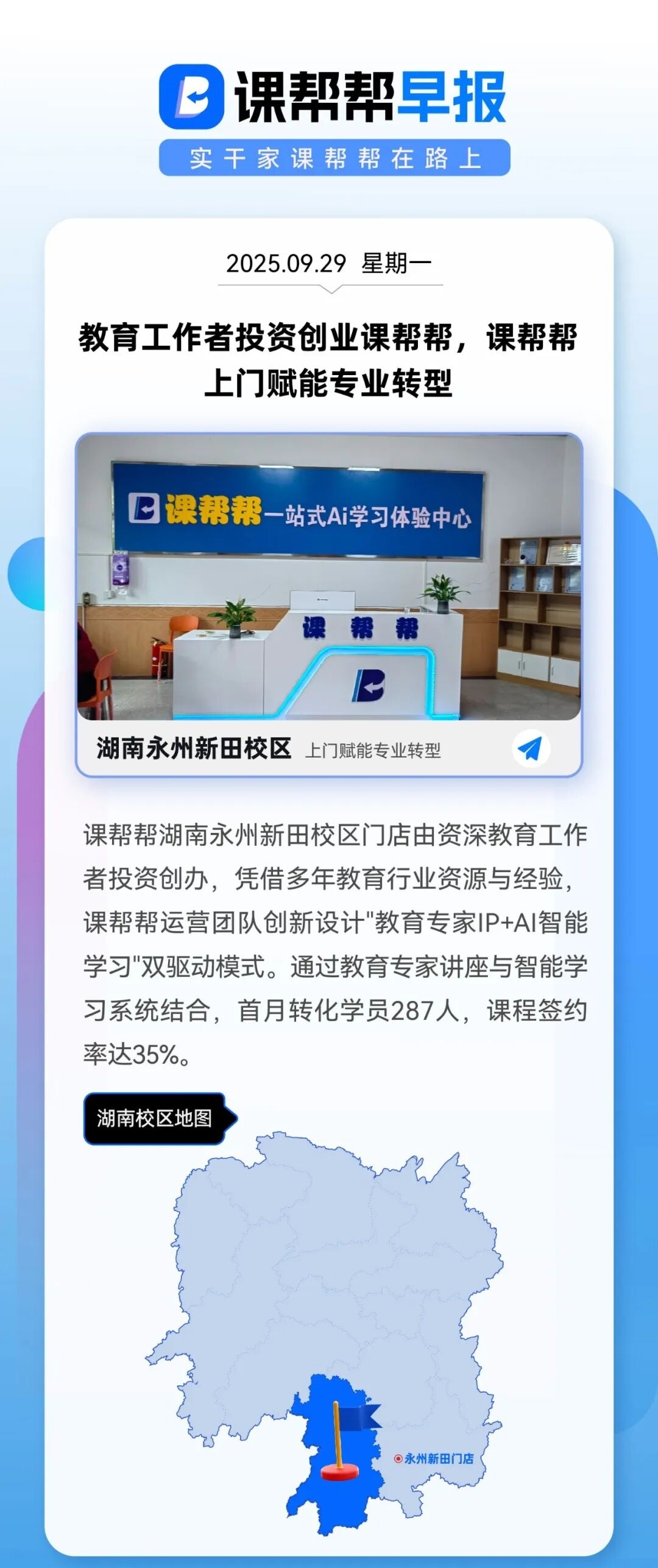 课帮帮湖南永州新田校区门店由资深教育工作者投资创办,凭借多年教育行业资源与经验,课帮帮运营团队创新设计"教育专家IP+AI智能学习"双驱动模式。通过教育专家讲座与智能学习系统结合,首月转化学员287人,课程签约率达35%。