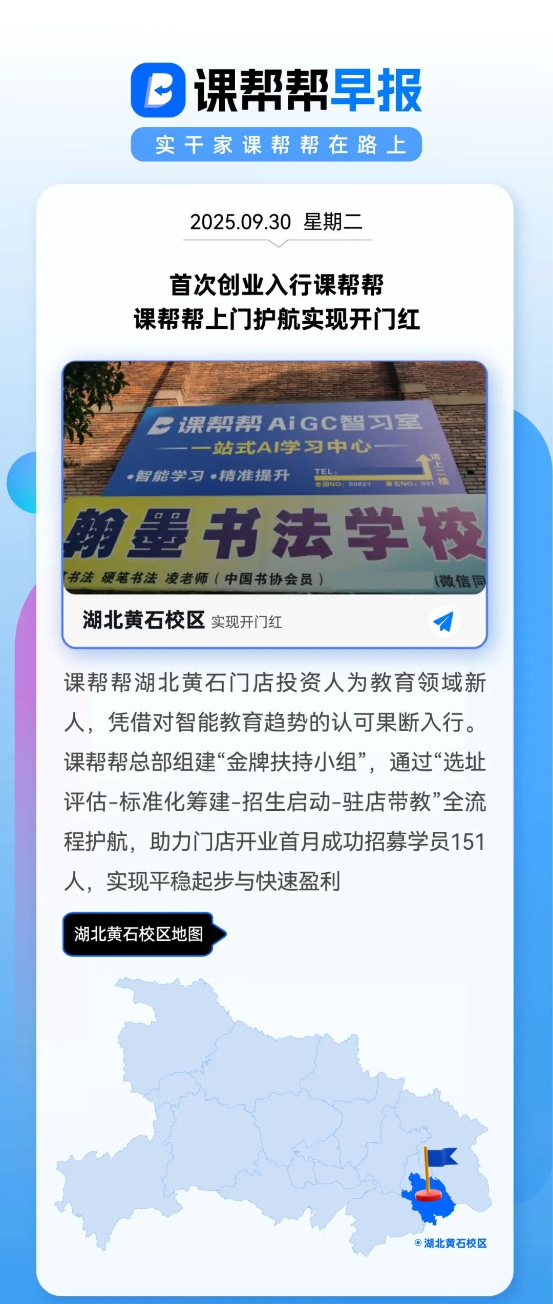 课帮帮湖北黄石门店投资人为教育领域新人,凭借对智能教育趋势的认可果断入行。课帮帮总部组建“金牌扶持小组”,通过“选址评估-标准化筹建-招生启动-驻店带教”全流程护航,助力门店开业首月成功招募学员151人,实现平稳起步与快速盈利