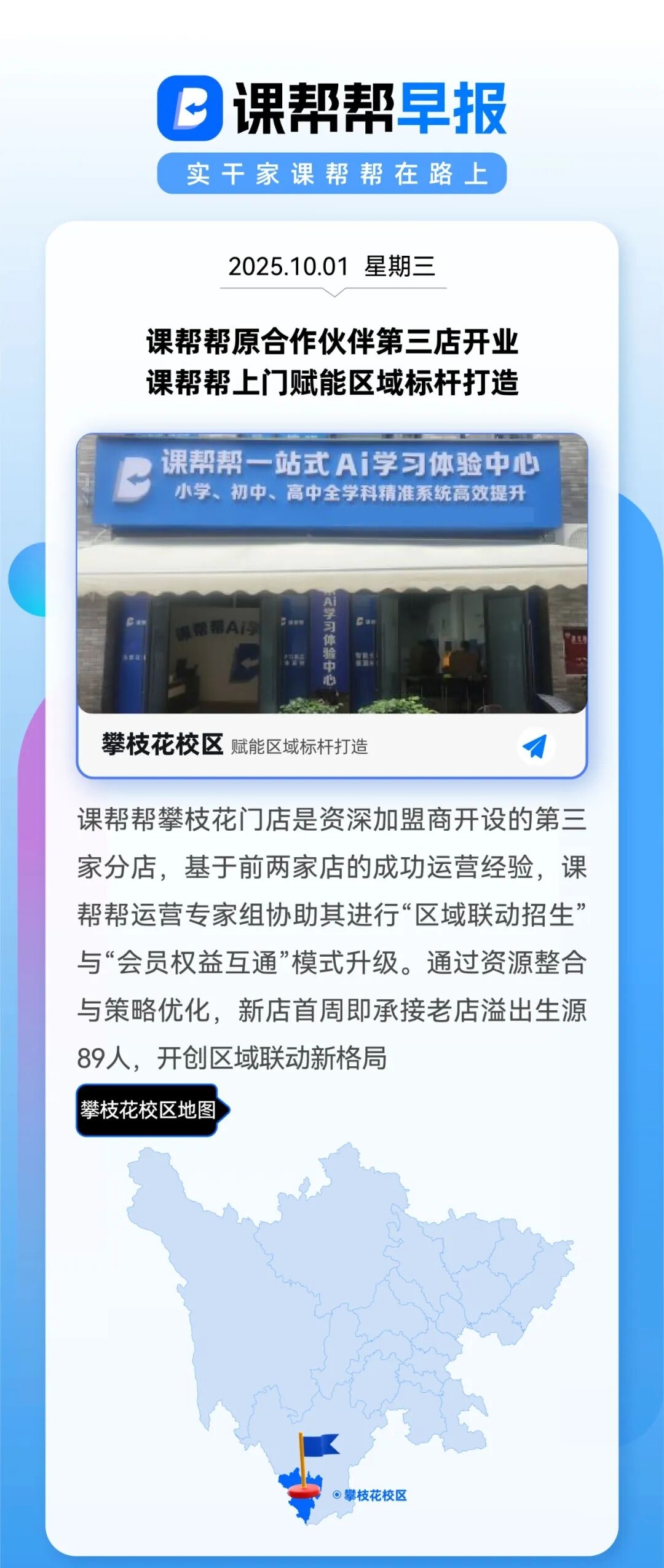 课帮帮攀枝花门店是资深加盟商开设的第三家分店,基于前两家店的成功运营经验,课帮帮运营专家组协助其进行“区域联动招生”与“会员权益互通”模式升级。通过资源整合与策略优化,新店首周即承接老店溢出生源89人,开创区域联动新格局