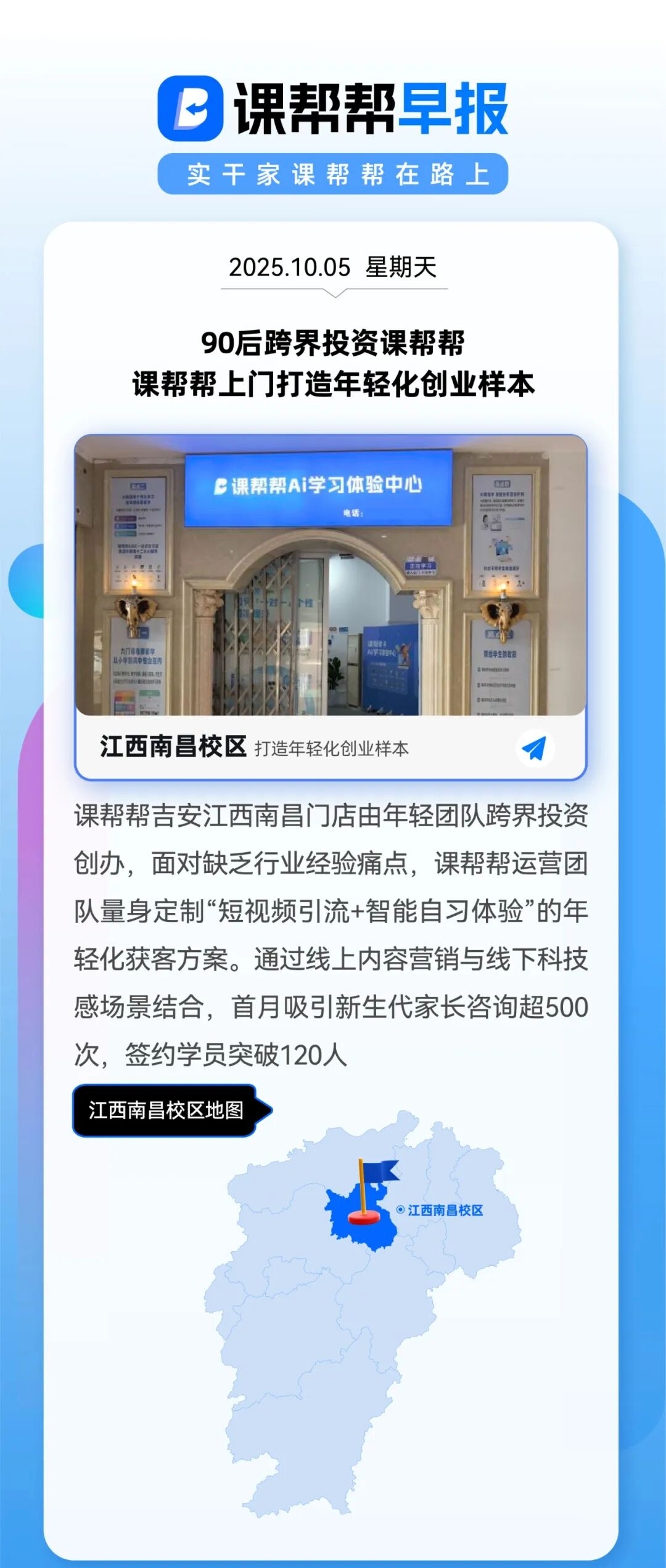课帮帮吉安江西南昌门店由年轻团队跨界投资创办,面对缺乏行业经验痛点,课帮帮运营团队量身定制“短视频引流+智能自习体验”的年轻化获客方案。通过线上内容营销与线下科技感场景结合,首月吸引新生代家长咨询超500次,签约学员突破120人
