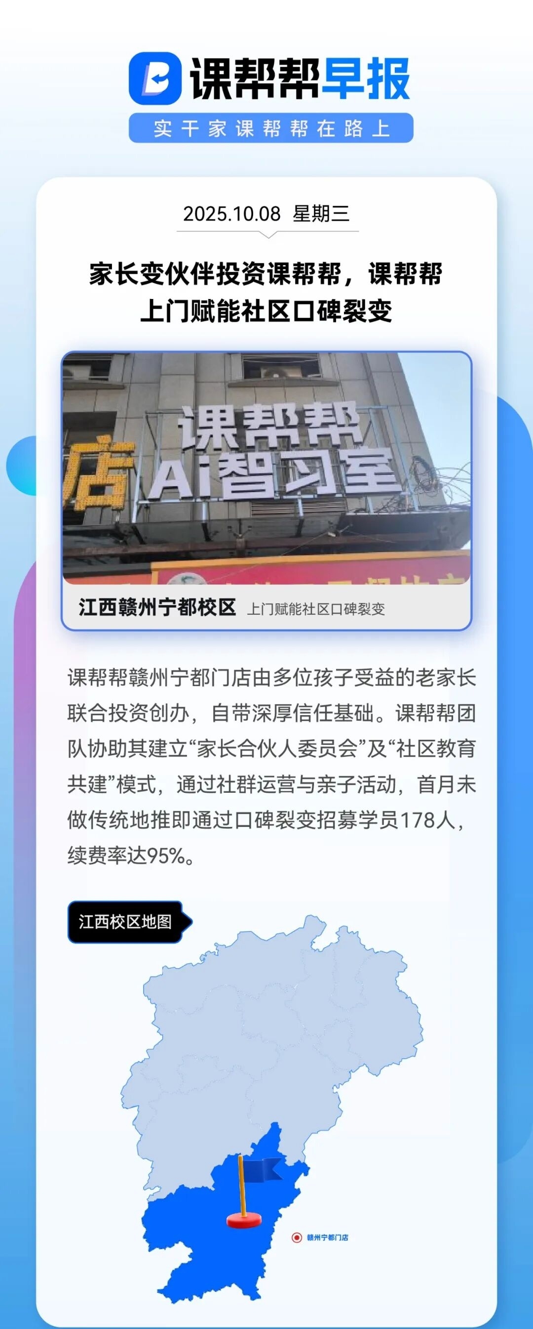课帮帮赣州宁都门店由多位孩子受益的老家长联合投资创办,自带深厚信任基础。课帮帮团队协助其建立“家长合伙人委员会”及“社区教育共建”模式,通过社群运营与亲子活动,首月未做传统地推即通过口碑裂变招募学员178人,续费率达95%。