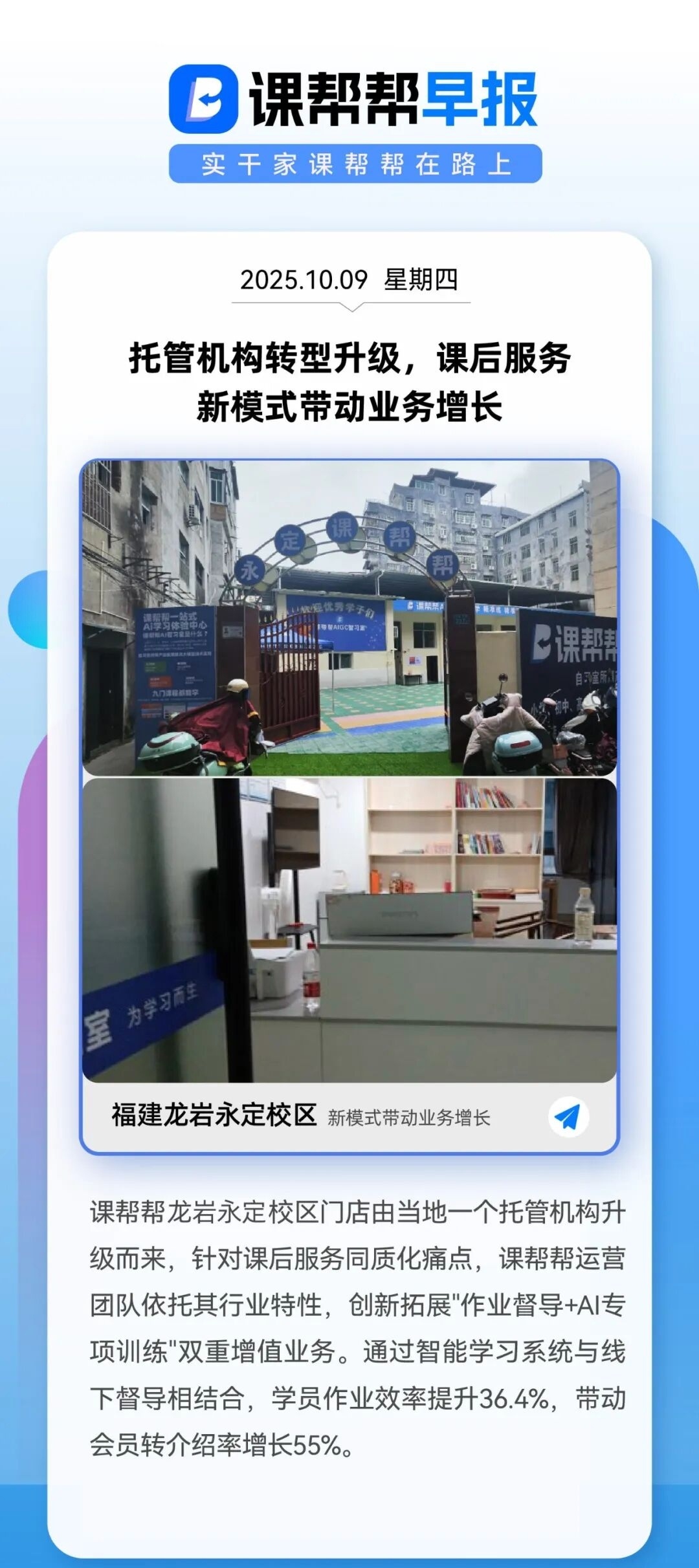 课帮帮龙岩永定校区门店由当地一个托管机构升级而来,针对课后服务同质化痛点,课帮帮运营团队依托其行业特性,创新拓展"作业督导+AI专项训练"双重增值业务。通过智能学习系统与线下督导相结合,学员作业效率提升36.4%,带动会员转介绍率增长55%。