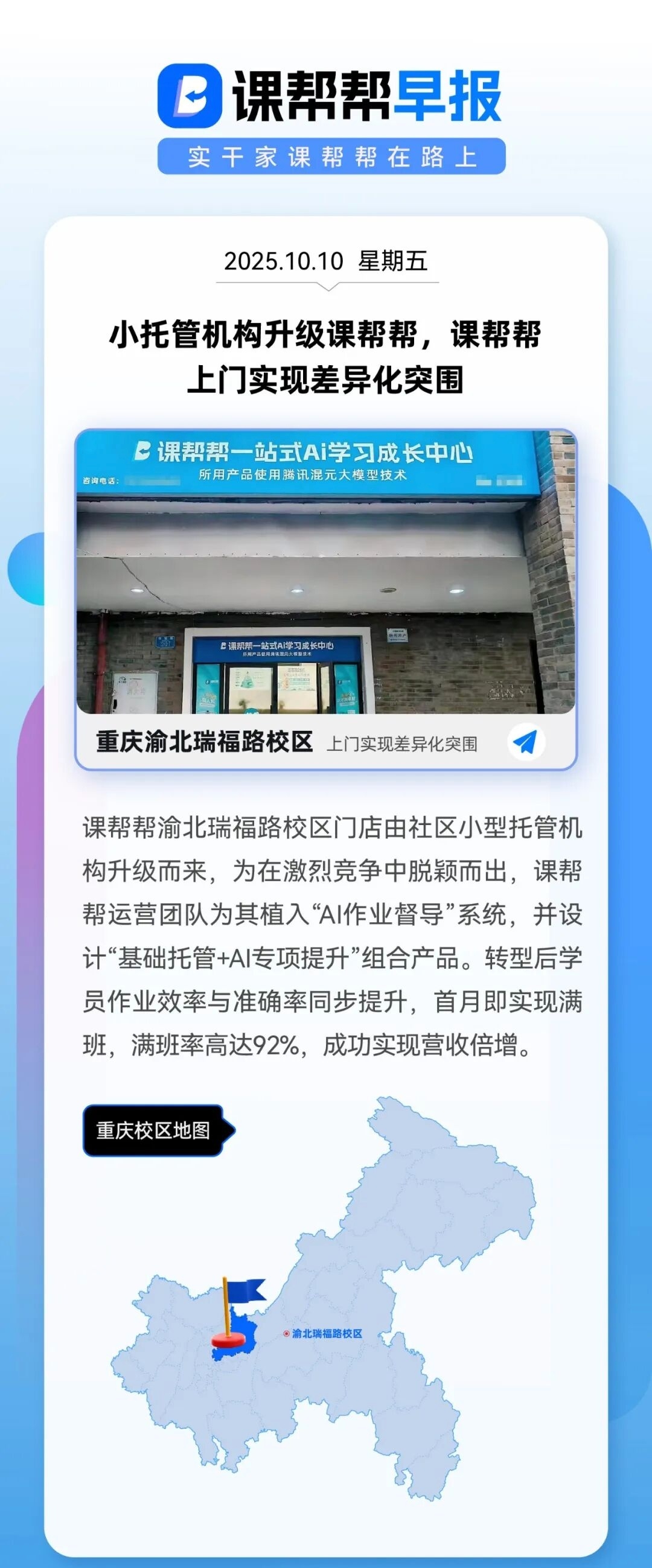 课帮帮渝北瑞福路校区门店由社区小型托管机构升级而来,为在激烈竞争中脱颖而出,课帮帮运营团队为其植入“AI作业督导”系统,并设计“基础托管+AI专项提升”组合产品。转型后学员作业效率与准确率同步提升,首月即实现满班,满班率高达92%,成功实现营收倍增。