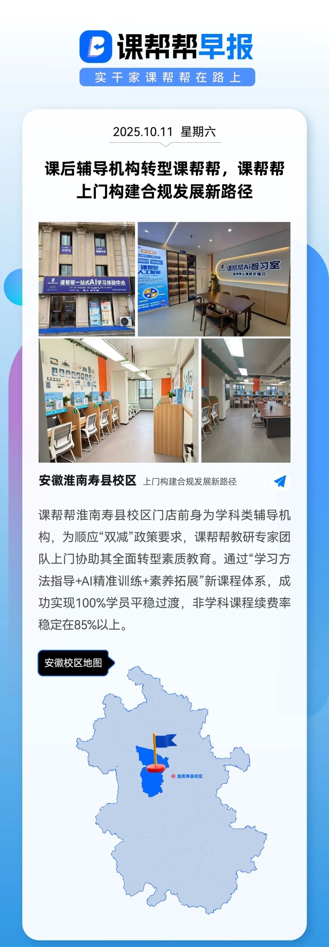 课帮帮淮南寿县校区门店前身为学科类辅导机构,为顺应“双减”政策要求,课帮帮教研专家团队上门协助其全面转型素质教育。通过“学习方法指导+AI精准训练+素养拓展”新课程体系,成功实现100%学员平稳过渡,非学科课程续费率稳定在85%以上。