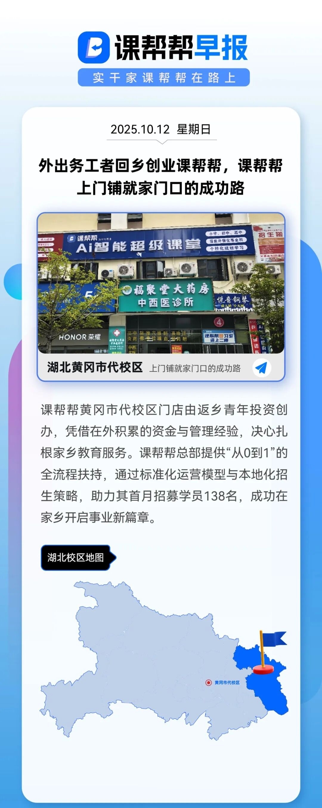课帮帮黄冈市代校区门店由返乡青年投资创办,凭借在外积累的资金与管理经验,决心扎根家乡教育服务。课帮帮总部提供“从0到1”的全流程扶持,通过标准化运营模型与本地化招生策略,助力其首月招募学员138名,成功在家乡开启事业新篇章。