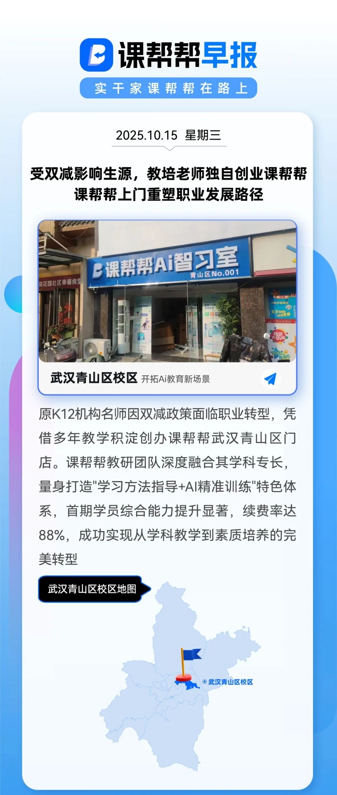 原K12机构名师因双减政策面临职业转型,凭借多年教学积淀创办课帮帮武汉青山区门店。课帮帮教研团队深度融合其学科专长,量身打造"学习方法指导+AI精准训练"特色体系,首期学员综合能力提升显著,续费率达88%,成功实现从学科教学到素质培养的完美转型