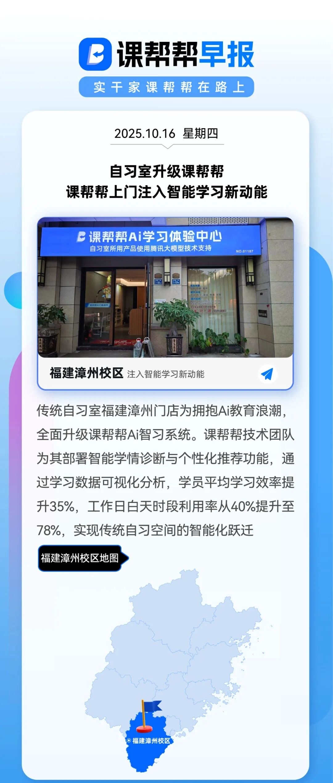 传统自习室福建漳州门店为拥抱Ai教育浪潮,全面升级课帮帮Ai智习系统。课帮帮技术团队为其部署智能学情诊断与个性化推荐功能,通过学习数据可视化分析,学员平均学习效率提升35%,工作日白天时段利用率从40%提升至78%,实现传统自习空间的智能化跃迁