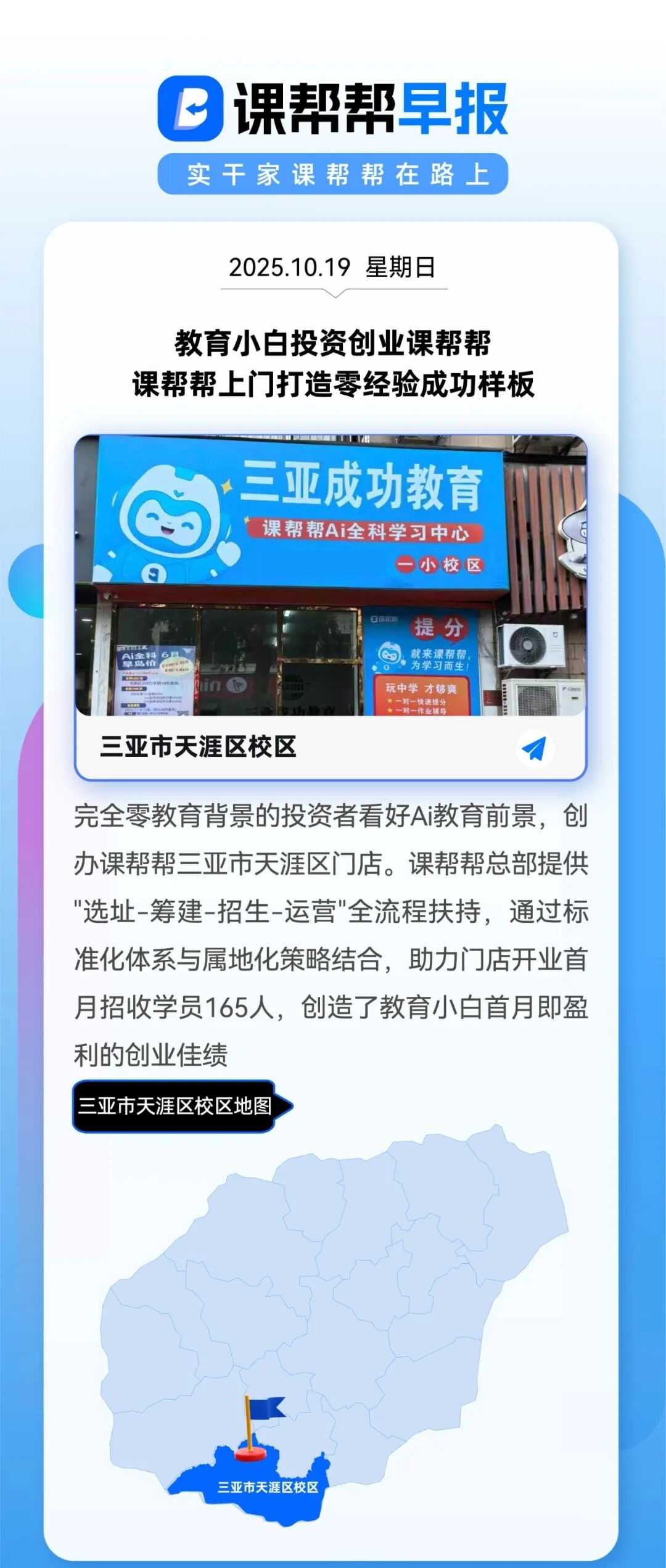 完全零教育背景的投资者看好Ai教育前景,创办课帮帮三亚市天涯区门店。课帮帮总部提供"选址-筹建-招生-运营"全流程扶持,通过标准化体系与属地化策略结合,助力门店开业首月招收学员165人,创造了教育小白首月即盈利的创业佳绩