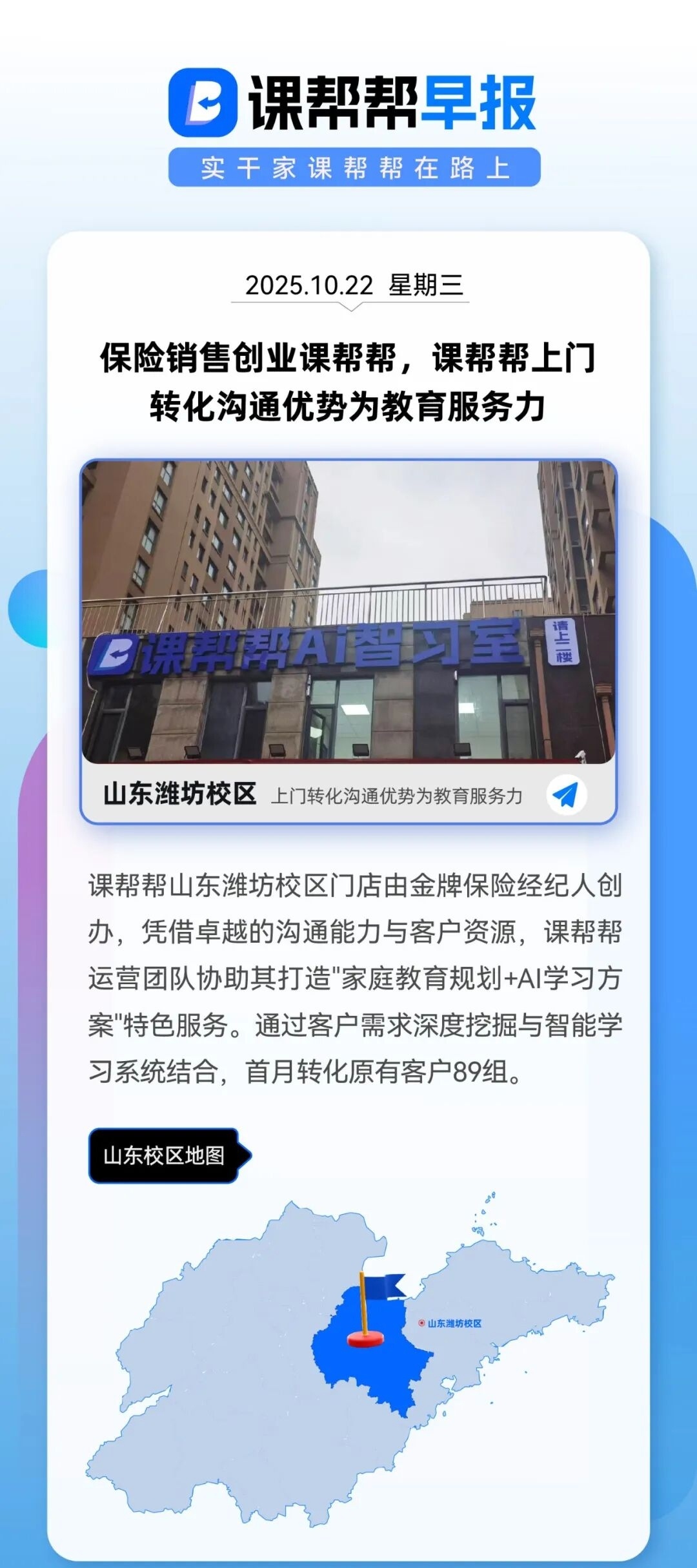 课帮帮山东潍坊校区门店由金牌保险经纪人创办,凭借卓越的沟通能力与客户资源,课帮帮运营团队协助其打造"家庭教育规划+AI学习方案"特色服务。通过客户需求深度挖掘与智能学习系统结合,首月转化原有客户89组。