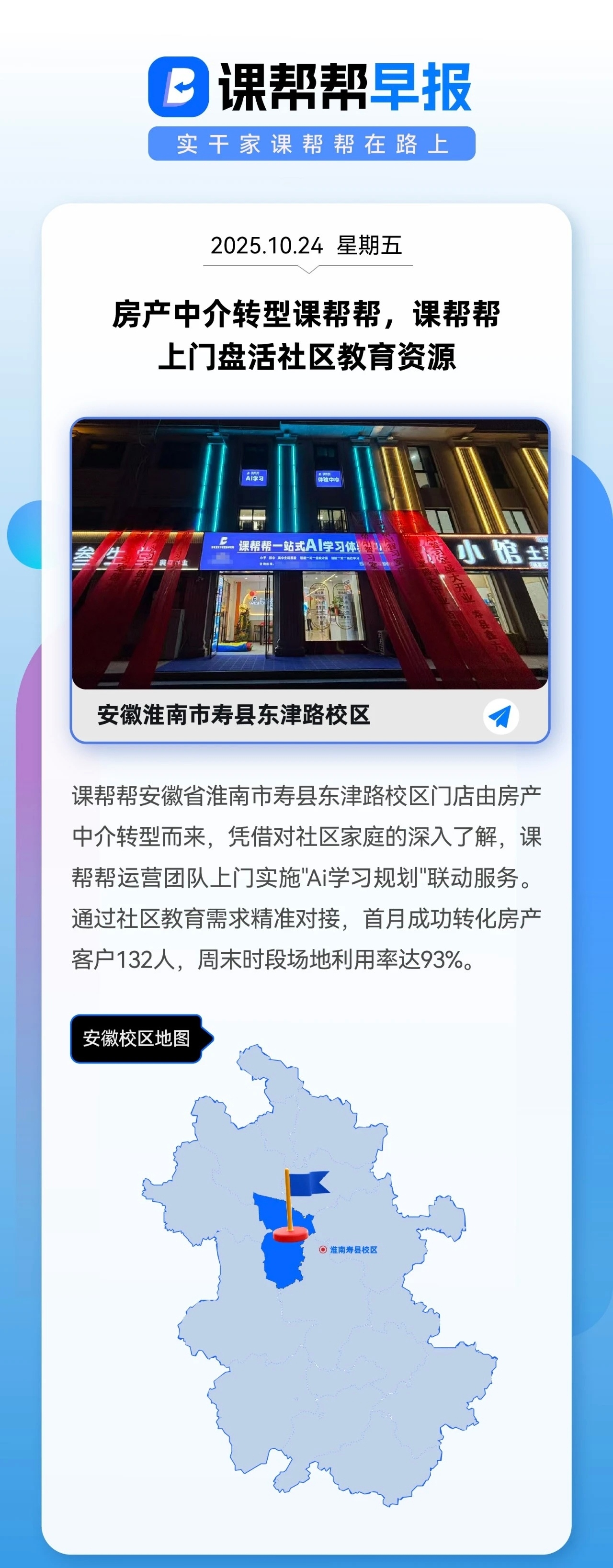 课帮帮安徽省淮南市寿县东津路校区门店由房产中介转型而来,凭借对社区家庭的深入了解,课帮帮运营团队上门实施"Ai学习规划"联动服务。通过社区教育需求精准对接,首月成功转化房产客户132人,周末时段场地利用率达93%。