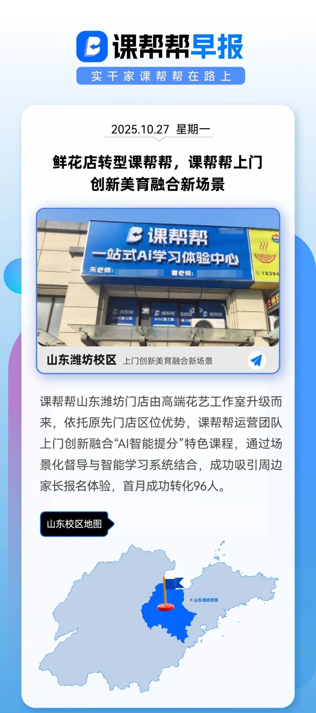 课帮帮山东潍坊门店由高端花艺工作室升级而来,依托原先门店区位优势,课帮帮运营团队上门创新融合“AI智能提分”特色课程,通过场景化督导与智能学习系统结合,成功吸引周边家长报名体验,首月成功转化96人。