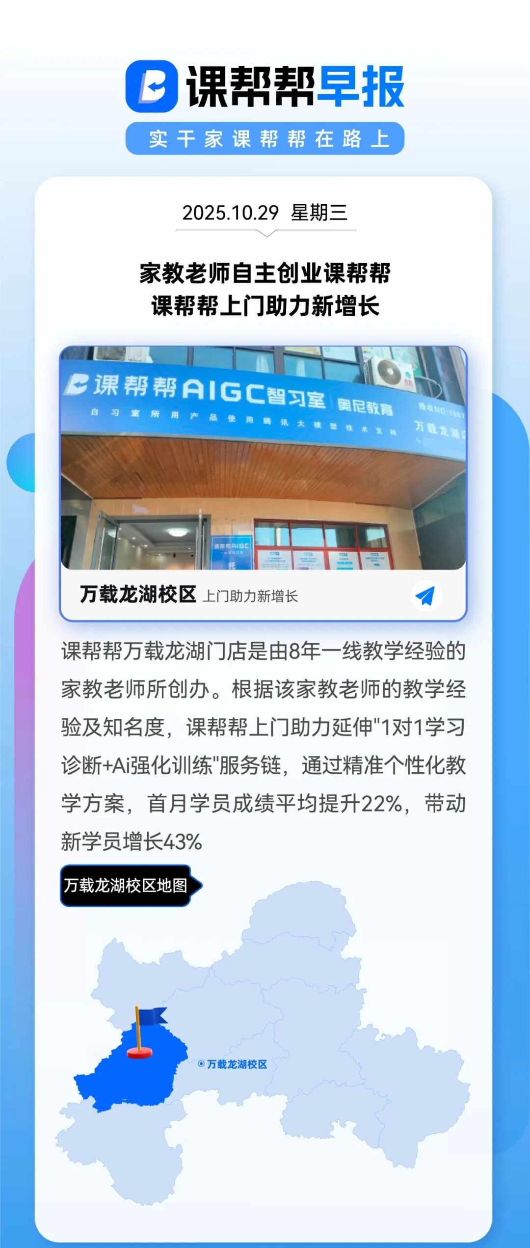 课帮帮万载龙湖门店是由8年一线教学经验的家教老师所创办。根据该家教老师的教学经验及知名度,课帮帮上门助力延伸"1对1学习诊断+Ai强化训练"服务链,通过精准个性化教学方案,首月学员成绩平均提升22%,带动新学员增长43%
