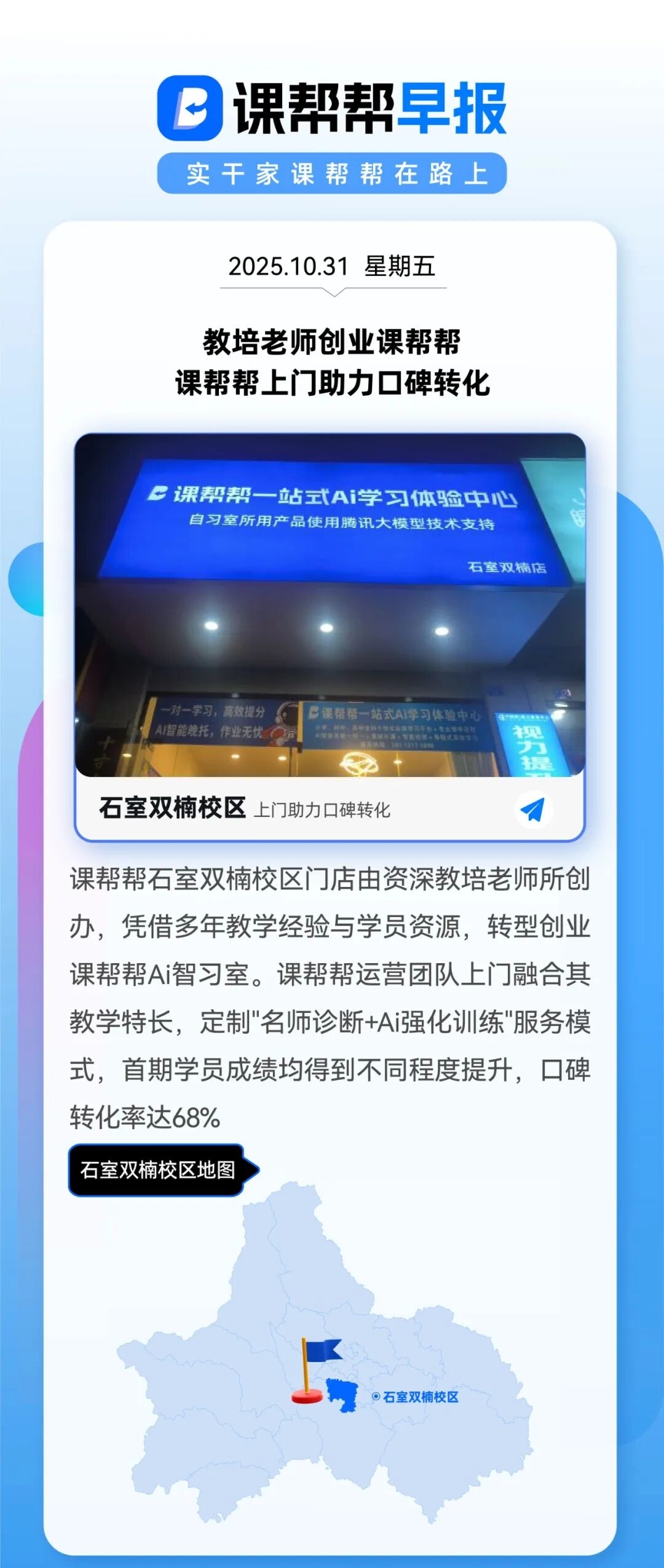课帮帮石室双楠校区门店由资深教培老师所创办,凭借多年教学经验与学员资源,转型创业课帮帮Ai智习室。课帮帮运营团队上门融合其教学特长,定制"名师诊断+Ai强化训练"服务模式,首期学员成绩均得到不同程度提升,口碑转化率达68%