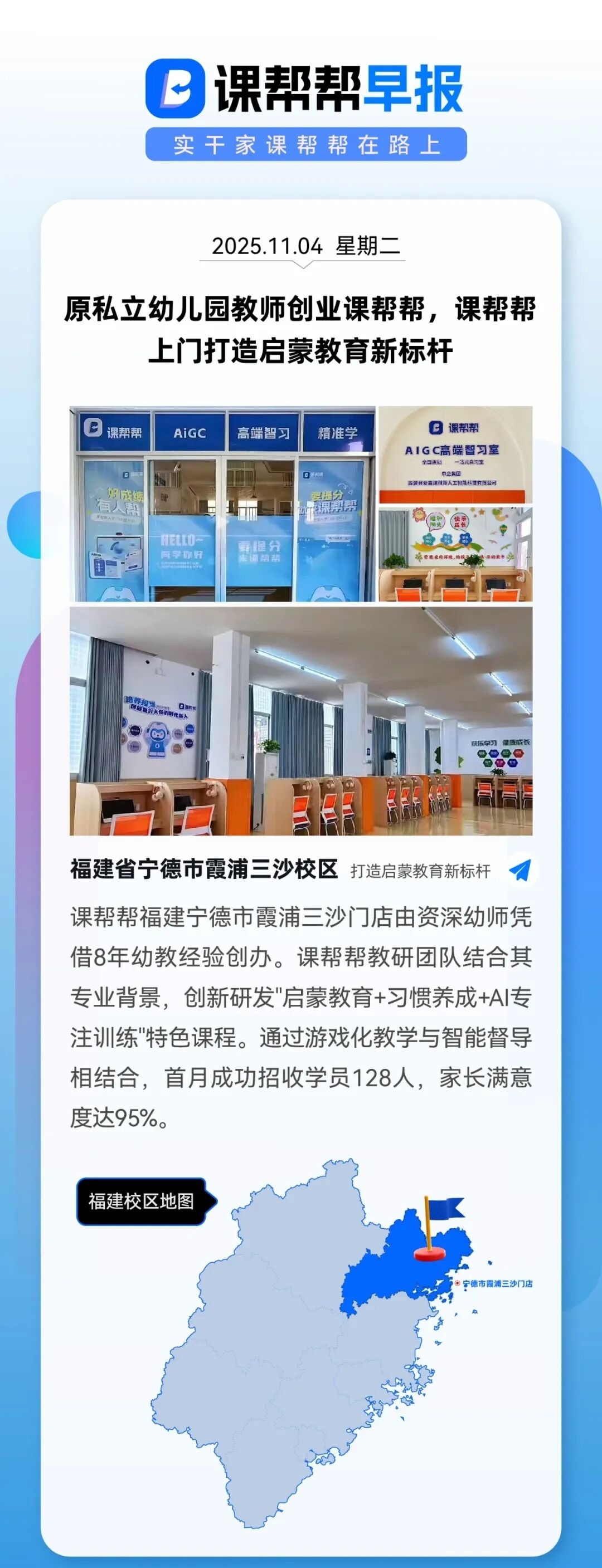 福建省宁德市霞浦三沙校区打造启蒙教育新标杆课帮帮福建宁德市霞浦三沙门店由资深幼师凭借8年幼教经验创办。课帮帮教研团队结合其专业背景,创新研发"启蒙教育+习惯养成+AI专注训练"特色课程。通过游戏化教学与智能督导相结合,首月成功招收学员128人,家长满意度达95%