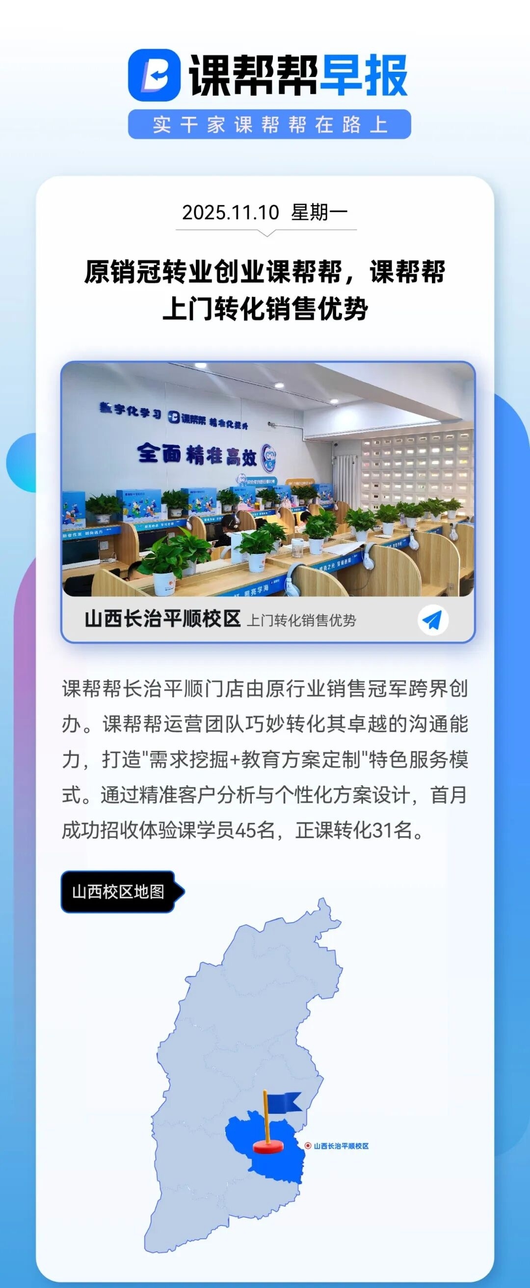 课帮帮长治平顺门店由原行业销售冠军跨界创办。课帮帮运营团队巧妙转化其卓越的沟通能力,打造"需求挖掘+教育方案定制"特色服务模式。通过精准客户分析与个性化方案设计,首月成功招收体验课学员45名,正课转化31名。