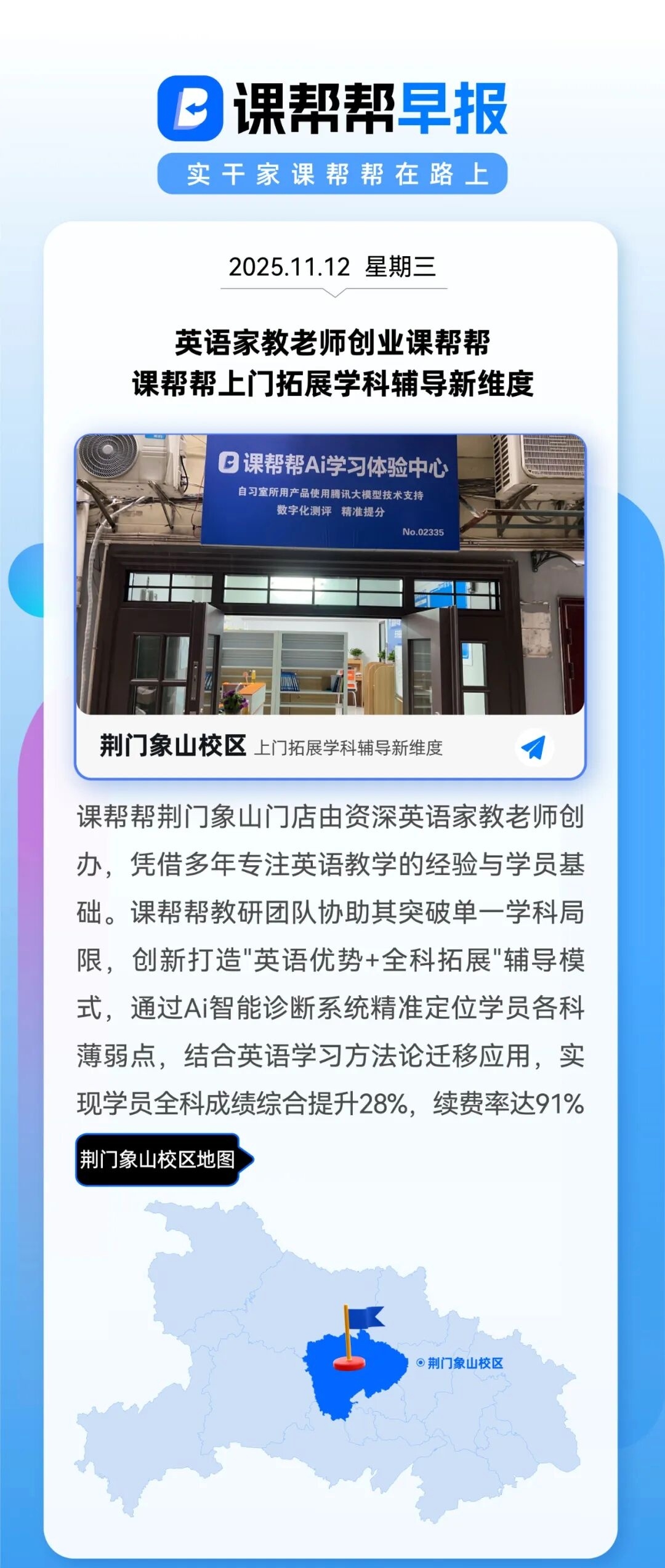 课帮帮荆门象山门店由资深英语家教老师创办,凭借多年专注英语教学的经验与学员基础。课帮帮教研团队协助其突破单一学科局限,创新打造"英语优势+全科拓展"辅导模式,通过Ai智能诊断系统精准定位学员各科薄弱点,结合英语学习方法论迁移应用,实现学员全科成绩综合提升28%,续费率达91%