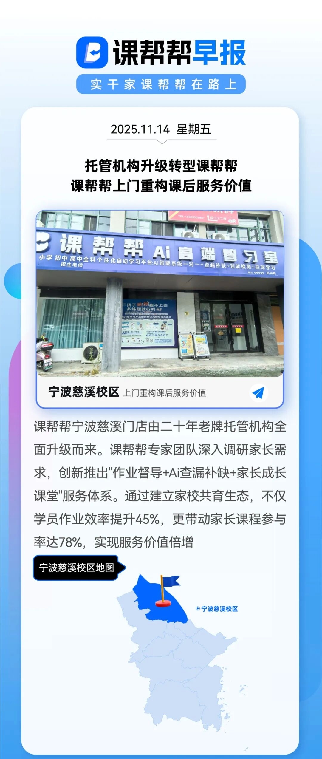 课帮帮宁波慈溪门店由二十年老牌托管机构全面升级而来。课帮帮专家团队深入调研家长需求,创新推出"作业督导+Ai查漏补缺+家长成长课堂"服务体系。通过建立家校共育生态,不仅学员作业效率提升45%,更带动家长课程参与率达78%,实现服务价值倍增