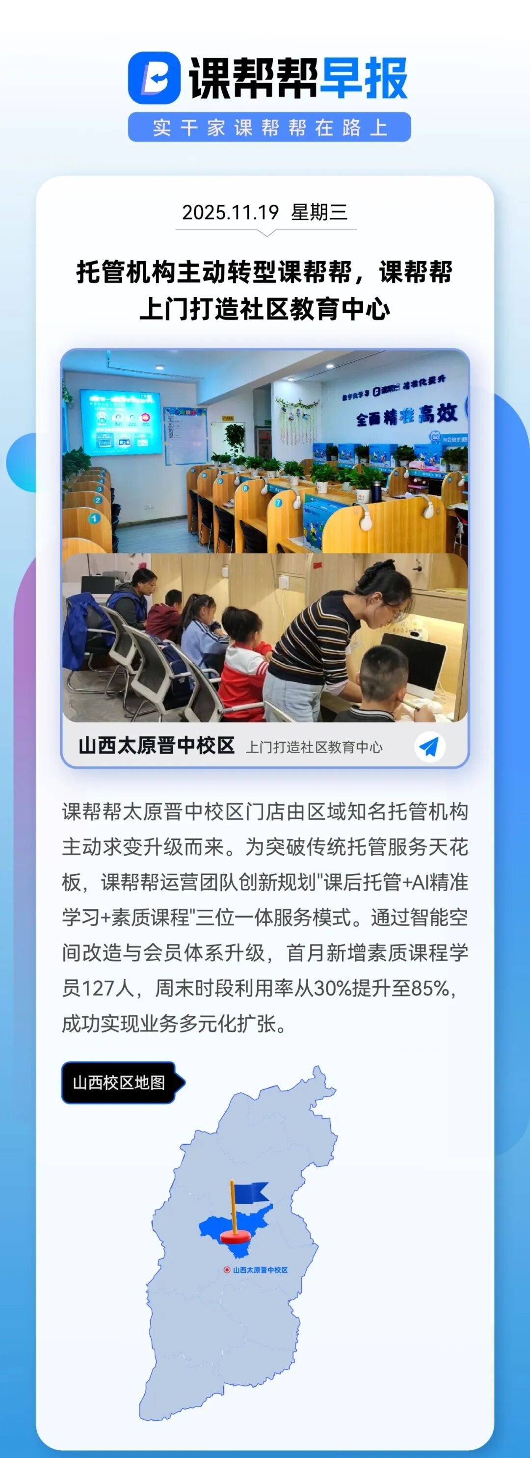 课帮帮太原晋中校区门店由区域知名托管机构主动求变升级而来。为突破传统托管服务天花板,课帮帮运营团队创新规划"课后托管+AI精准学习+素质课程"三位一体服务模式。通过智能空间改造与会员体系升级,首月新增素质课程学员127人,周末时段利用率从30%提升至85%,成功实现业务多元化扩张。