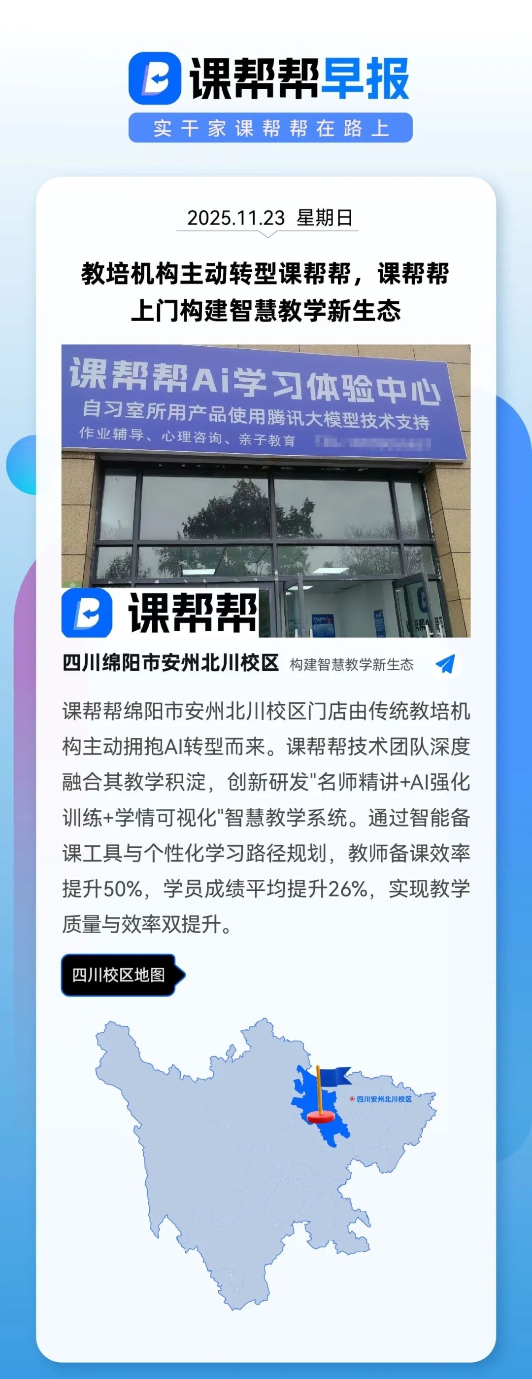 课帮帮绵阳市安州北川校区门店由传统教培机构主动拥抱AI转型而来。课帮帮技术团队深度融合其教学积淀,创新研发"名师精讲+AI强化训练+学情可视化"智慧教学系统。通过智能备课工具与个性化学习路径规划,教师备课效率提升50%,学员成绩平均提升26%,实现教学质量与效率双提升。