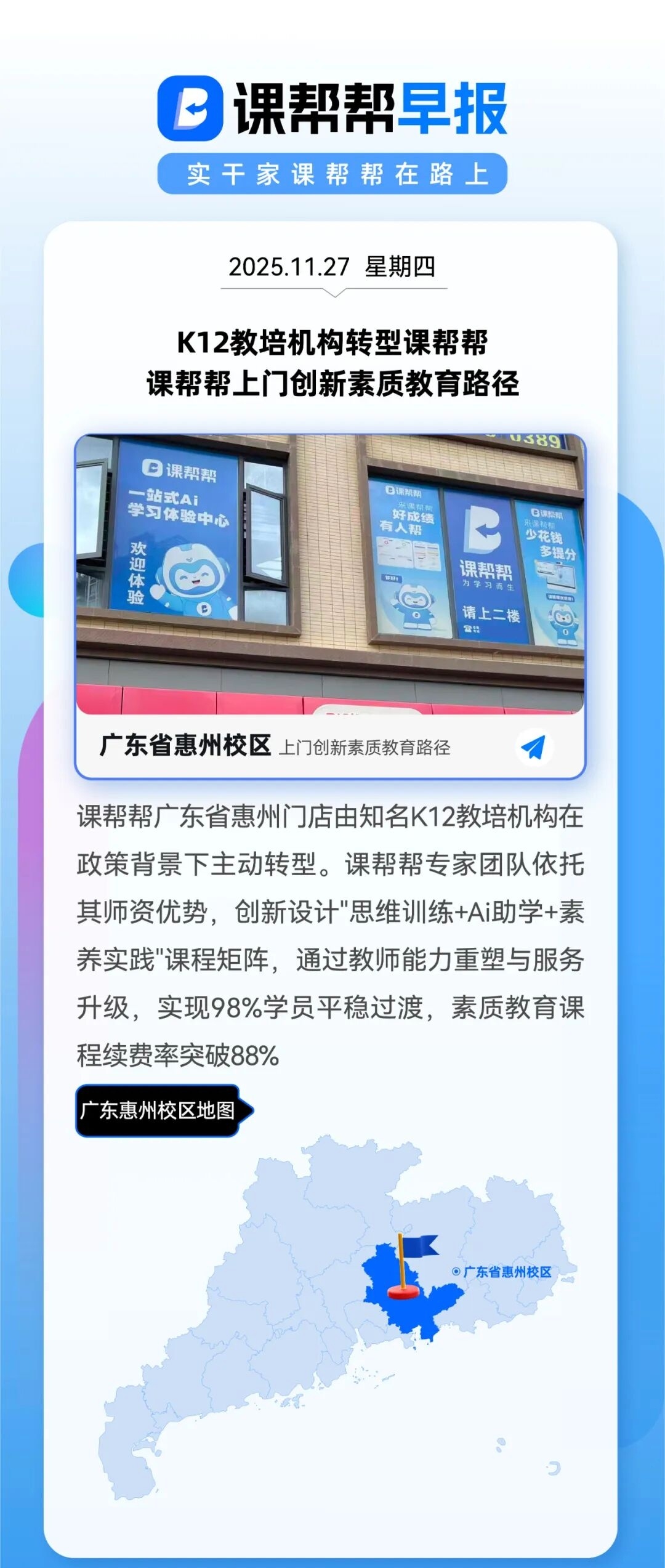 课帮帮广东省惠州门店由知名K12教培机构在政策背景下主动转型。课帮帮专家团队依托其师资优势,创新设计"思维训练+Ai助学+素养实践"课程矩阵,通过教师能力重塑与服务升级,实现98%学员平稳过渡,素质教育课程续费率突破88%