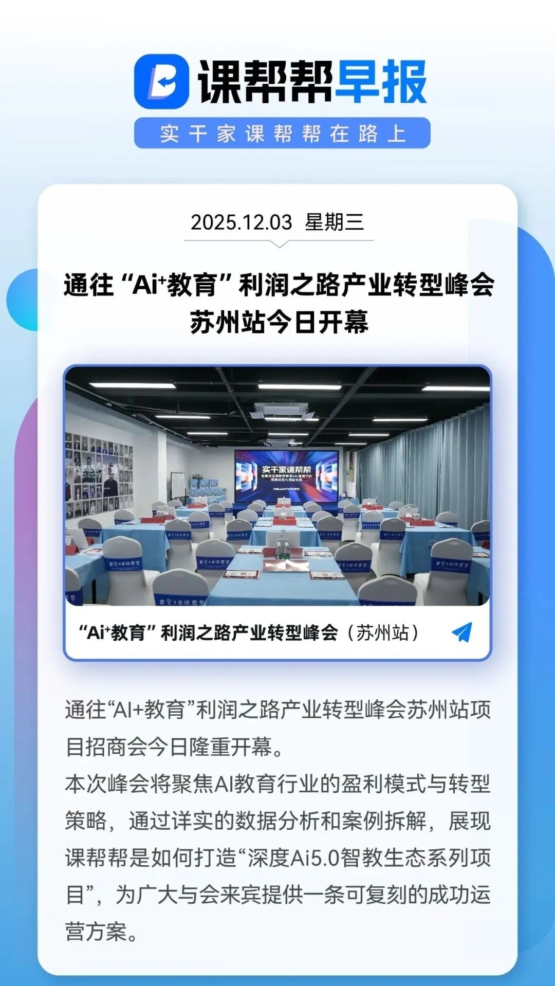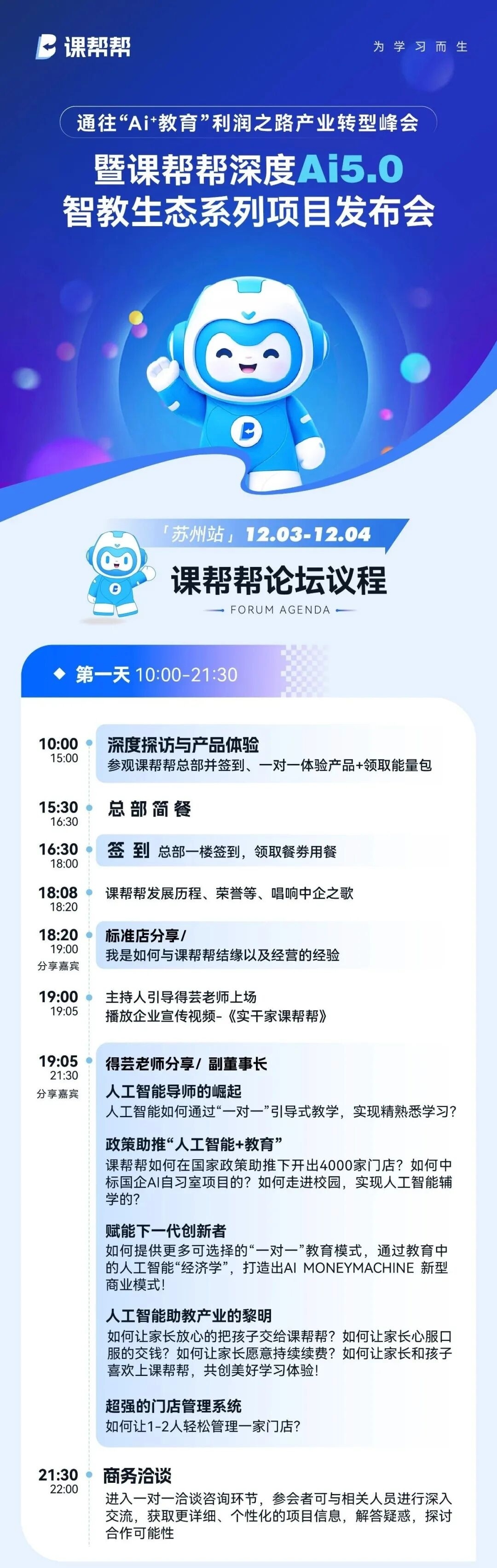 本次峰会将聚焦AI教育行业的盈利模式与转型策略,通过详实的数据分析和案例拆解,展现课帮帮是如何打造“深度Ai5.0智教生态系列项目”,为广大与会来宾提供一条可复刻的成功运营方案。