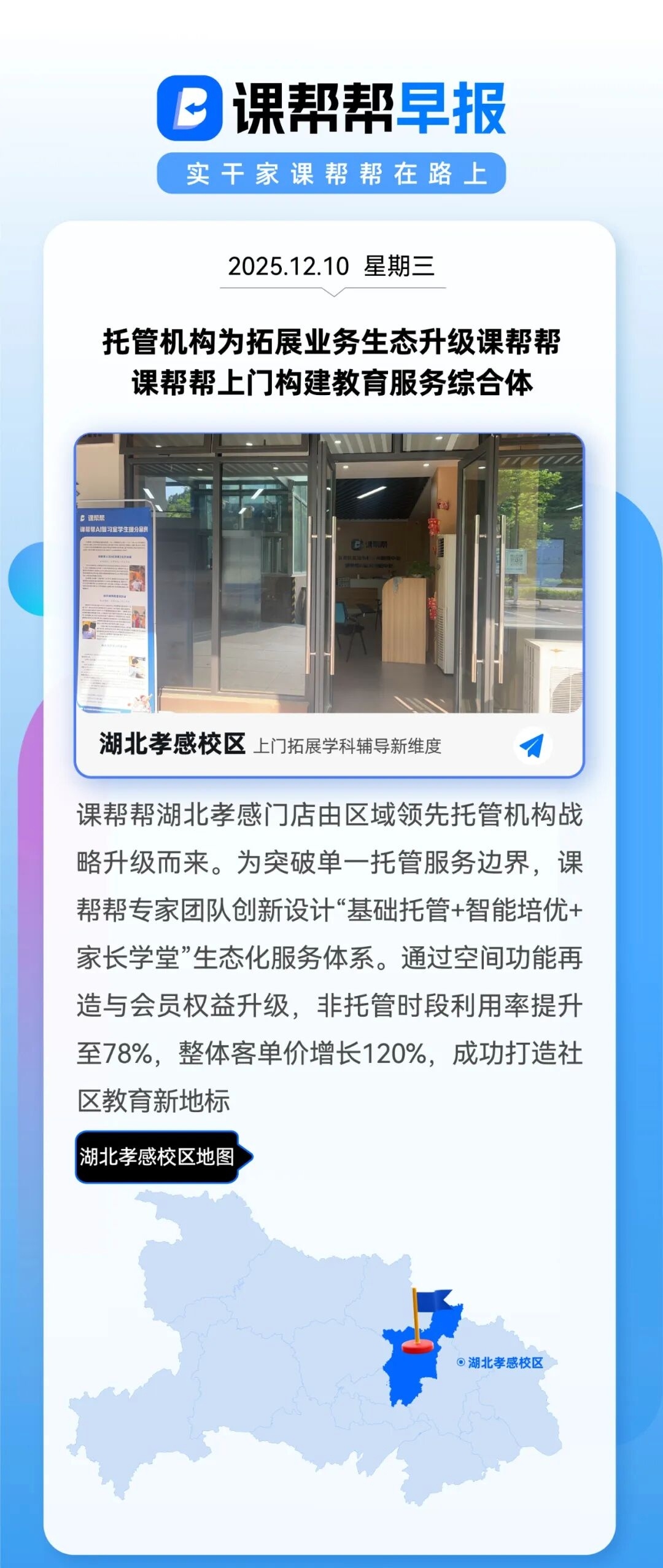 课帮帮湖北孝感门店由区域领先托管机构战略升级而来。为突破单一托管服务边界,课帮帮专家团队创新设计"基础托管+智能培优+家长学堂"生态化服务体系。通过空间功能再造与会员权益升级,非托管时段利用率提升至78%,整体客单价增长120%,成功打造社区教育新地标