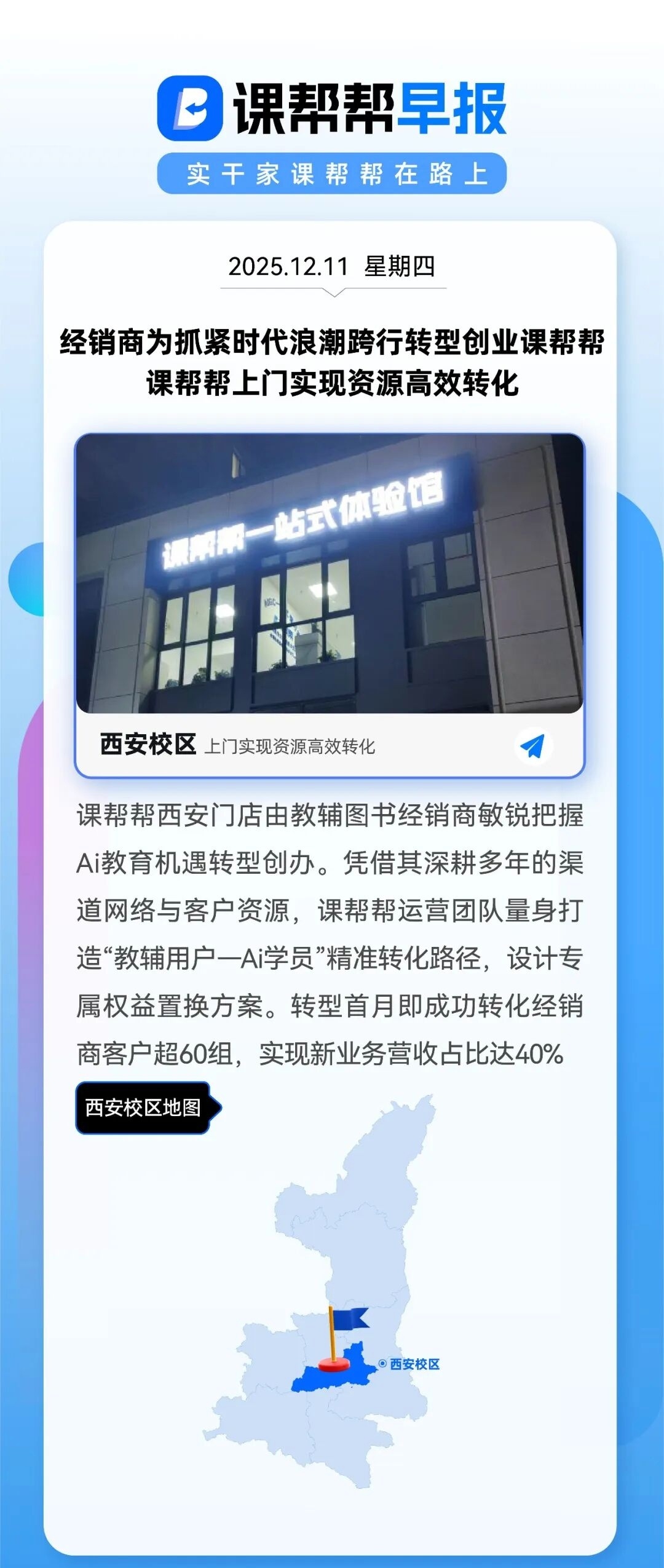 课帮帮西安门店由教辅图书经销商敏锐把握 Ai教育机遇转型创办。凭借其深耕多年的渠道网络与客户资源,课帮帮运营团队量身打造"教辅用户一Ai学员"精准转化路径,设计专属权益置换方案。转型首月即成功转化经销商客户超60组,实现新业务营收占比达40%