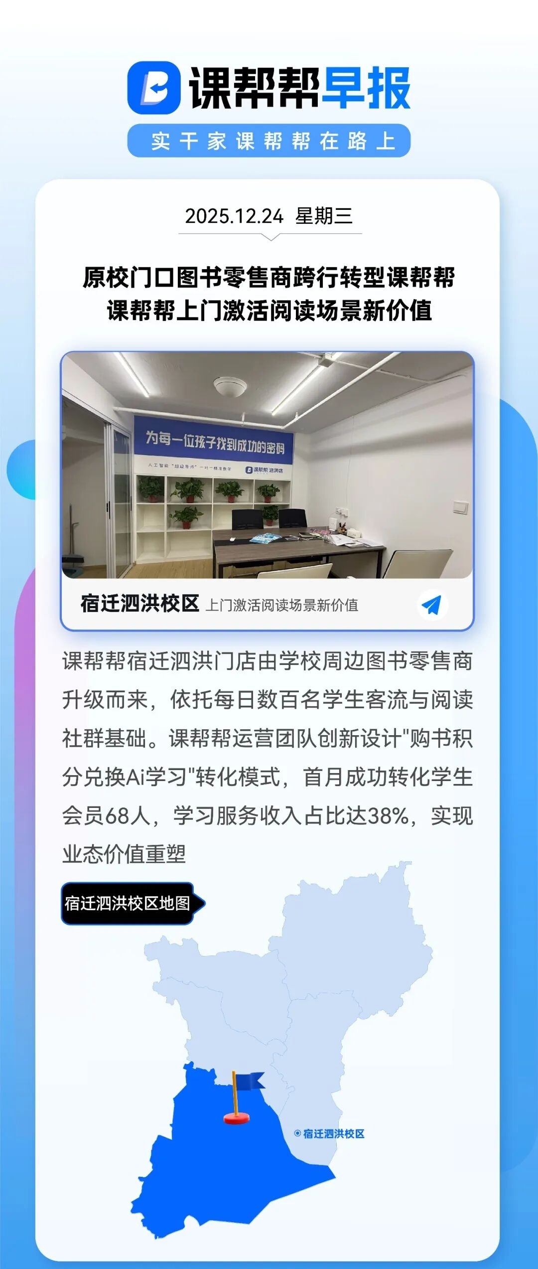 课帮帮宿迁泗洪门店由学校周边图书零售商升级而来,依托每日数百名学生客流与阅读社群基础。课帮帮运营团队创新设计"购书积分兑换Ai学习"转化模式,首月成功转化学生会员68人,学习服务收入占比达38%,实现业态价值重塑