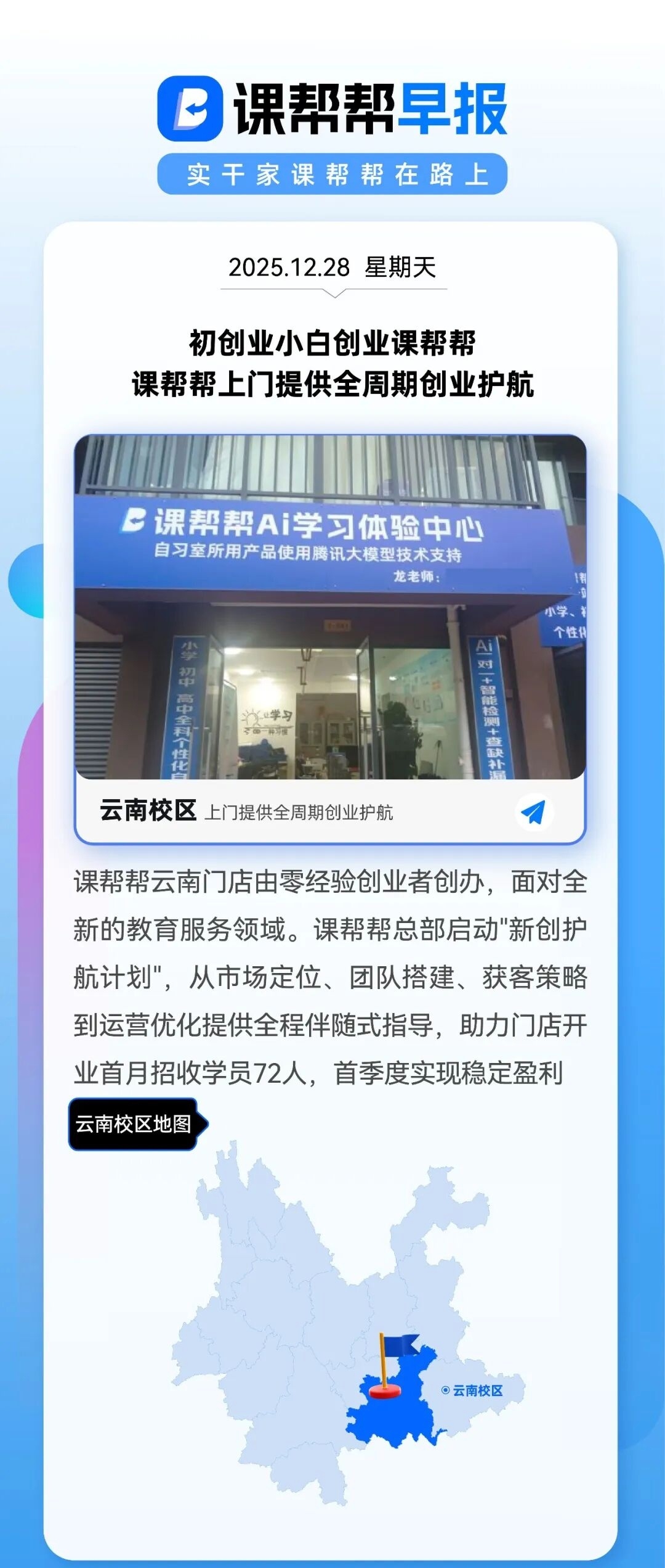 课帮帮云南门店由零经验创业者创办,面对全新的教育服务领域。课帮帮总部启动"新创护航计划",从市场定位,团队搭建,获客策略到运营优化提供全程伴随式指导,助力门店开业首月招收学员72人,首季度实现稳定盈利