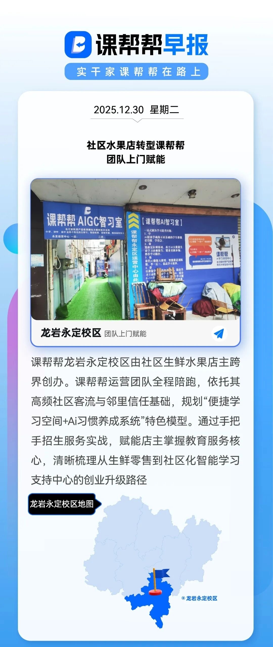 课帮帮龙岩永定校区由社区生鲜水果店主跨界创办。课帮帮运营团队全程陪跑,依托其高频社区客流与邻里信任基础,规划"便捷学习空间+Ai习惯养成系统"特色模型。通过手把手招生服务实战,赋能店主掌握教育服务核心,清晰梳理从生鲜零售到社区化智能学习支持中心的创业升级路径