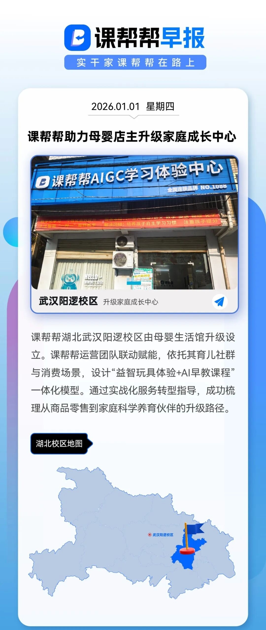 课帮帮湖北武汉阳逻校区由母婴生活馆升级设立。课帮帮运营团队联动赋能,依托其育儿社群与消费场景,设计"益智玩具体验+AI早教课程"一体化模型。通过实战化服务转型指导,成功梳理从商品零售到家庭科学养育伙伴的升级路径。