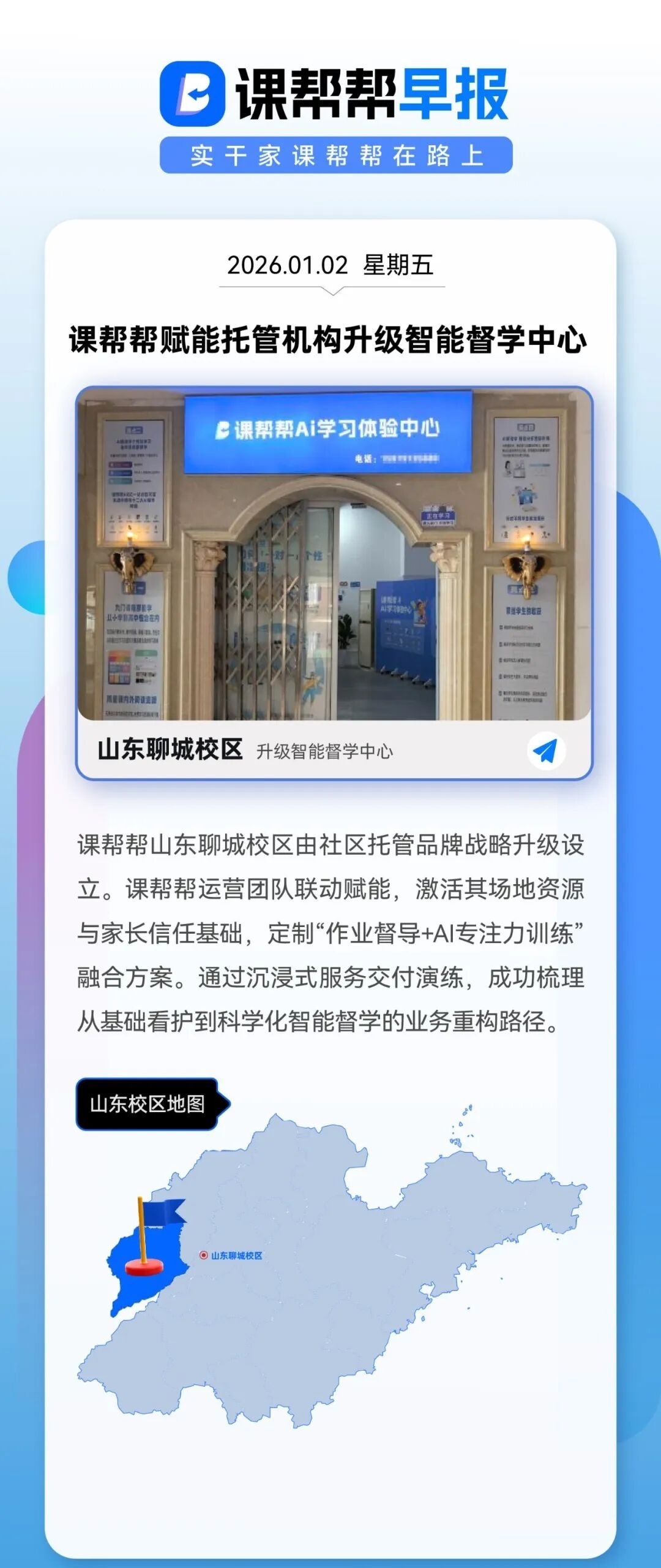 课帮帮山东聊城校区由社区托管品牌战略升级设立。课帮帮运营团队联动赋能,激活其场地资源与家长信任基础,定制"作业督导+Al专注力训练"融合方案。通过沉浸式服务交付演练,成功梳理从基础看护到科学化智能督学的业务重构路径。