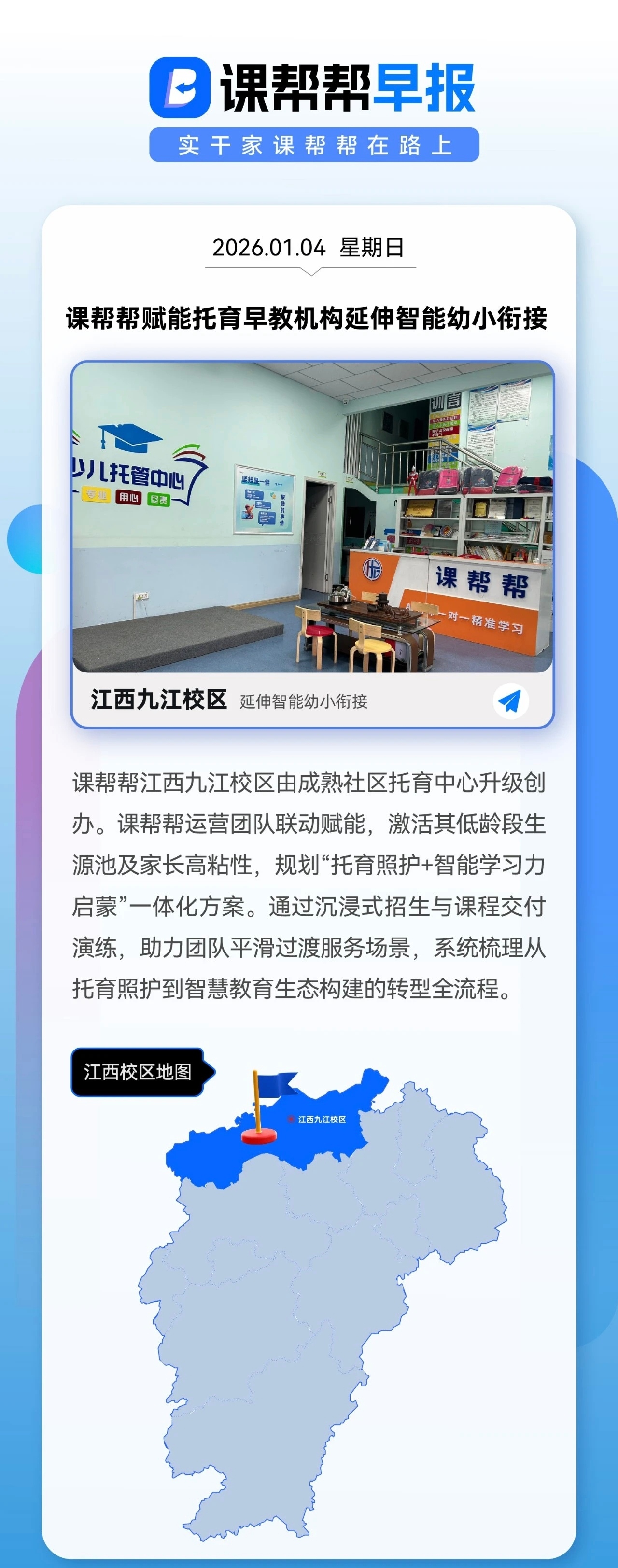 课帮帮江西九江校区由成熟社区托育中心升级创办。课帮帮运营团队联动赋能,激活其低龄段生源池及家长高粘性,规划"托育照护+智能学习力启蒙"一体化方案。通过沉浸式招生与课程交付演练,助力团队平滑过渡服务场景,系统梳理从托育照护到智慧教育生态构建的转型全流程。