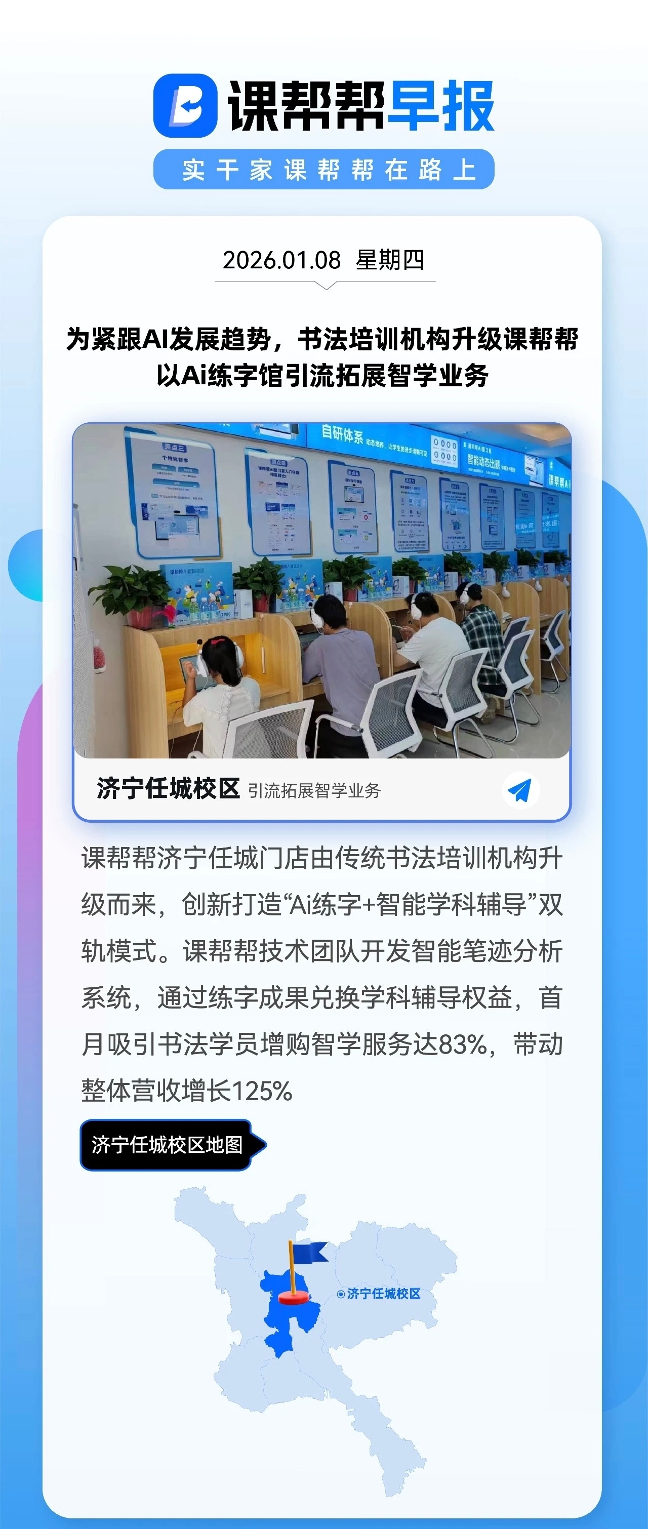 课帮帮济宁任城门店由传统书法培训机构升级而来,创新打造"Ai练字+智能学科辅导"双轨模式。课帮帮技术团队开发智能笔迹分析系统,通过练字成果兑换学科辅导权益,首月吸引书法学员增购智学服务达83%,带动整体营收增长125%